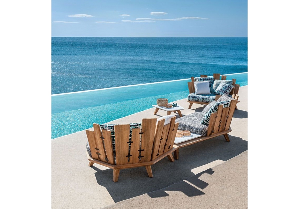 Rafael Lounge, von Paola Navone für Ethimo entworfen, ist ein Sessel mit integriertem Couchtisch, der durch eine Teakholzschale, Stoffkissen und eine Marmor- oder Lavasteinplatte strukturiert ist. Rafael Lounge ist in verschiedenen Ausführungen erhältlich.