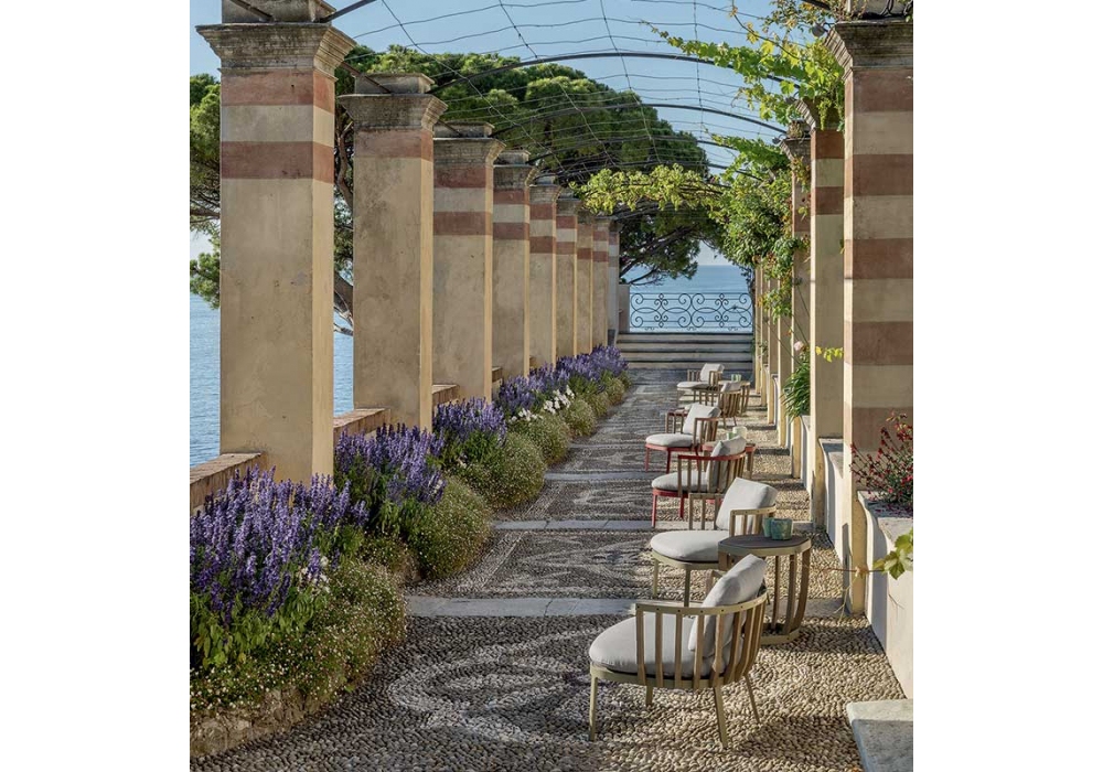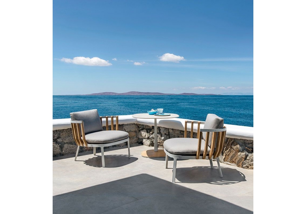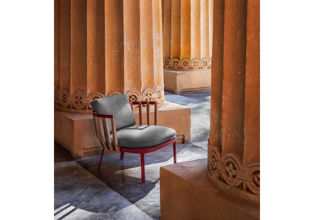 Swing von Patrick Norguet für Ethimo entworfen, ist ein Outdoor-Clubsessel mit Struktur aus lackiertem Aluminium und Teakholz und Stoffkissen. Swing ist in verschiedenen Ausführungen erhältlich.