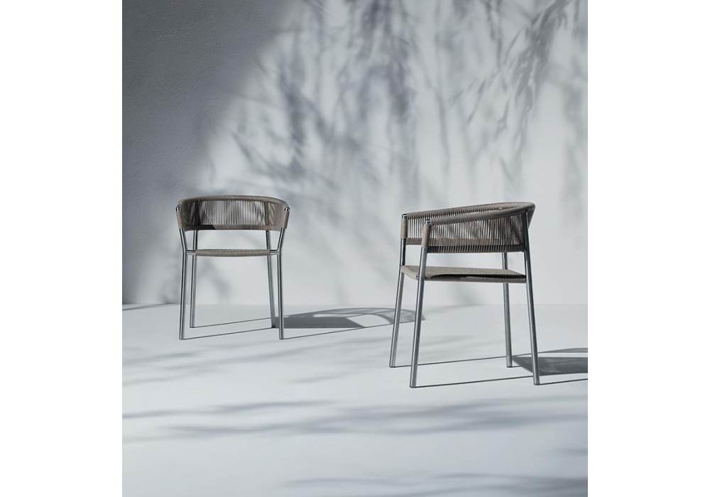 Kilt Steel von Marcello Ziliani für Ethimo entworfen, ist ein Sessel mit tragender Struktur aus blankem Edelstahlrohr. Sitzfläche und Rückenlehne sind mit einem grauen Kordelgeflecht bezogen.