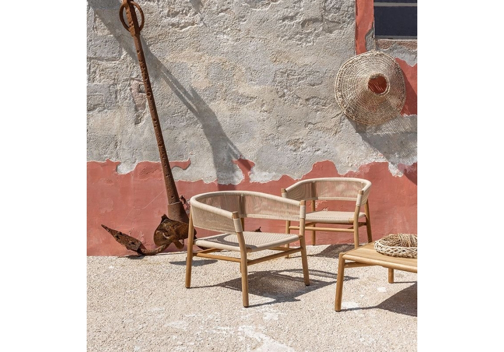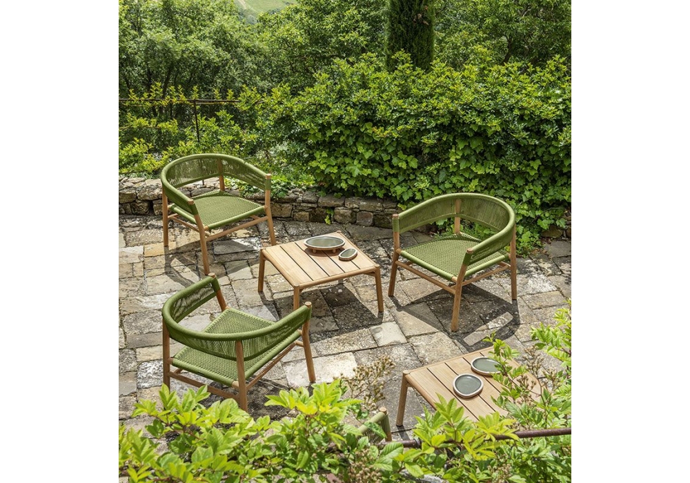 Kilt von Marcello Ziliani für Ethimo entworfen, ist ein Sessel mit tragender Struktur aus Teakholz. Sitzfläche und Rückenlehne sind mit einem Seilgeflecht bespannt. Kilt ist in verschiedenen Ausführungen erhältlich.