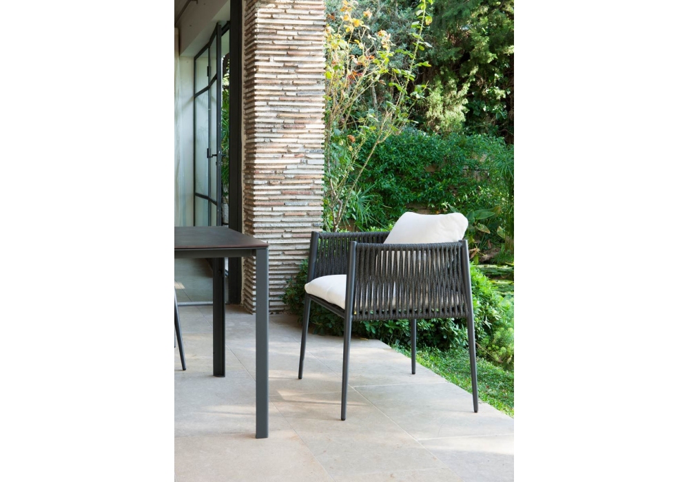Luce, entworfen und hergestellt von Unopiù, ist ein Armstuhl mit graphitfarbener Aluminiumstruktur, handbespannt mit Polyolefinseil. Die Sitz- und Rückenkissen bestehen aus Acrylgewebe in verschiedenen Ausführungen.