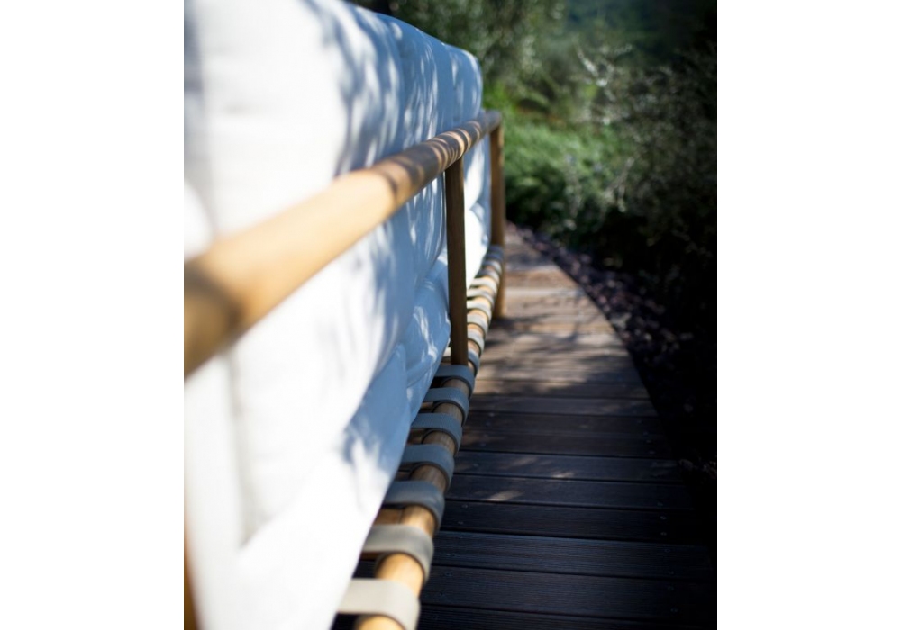 Pevero, entworfen und hergestellt von Unopiù, ist ein Sessel mit Teakholzstruktur. Die Sitz- und Rückenkissen bestehen aus Acrylgewebe in verschiedenen Ausführungen.