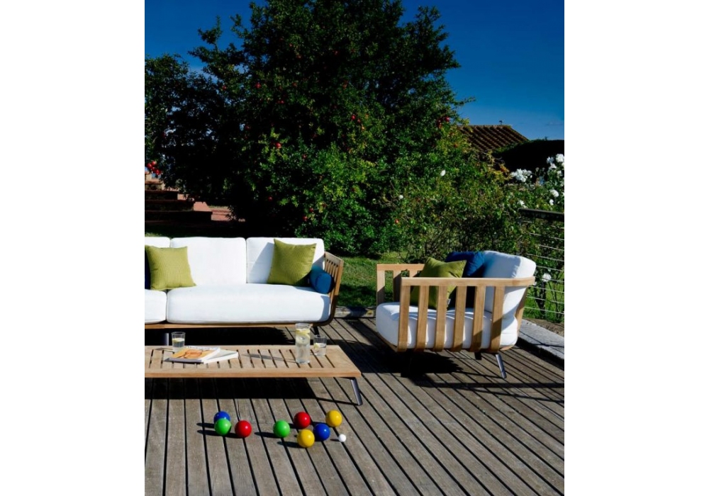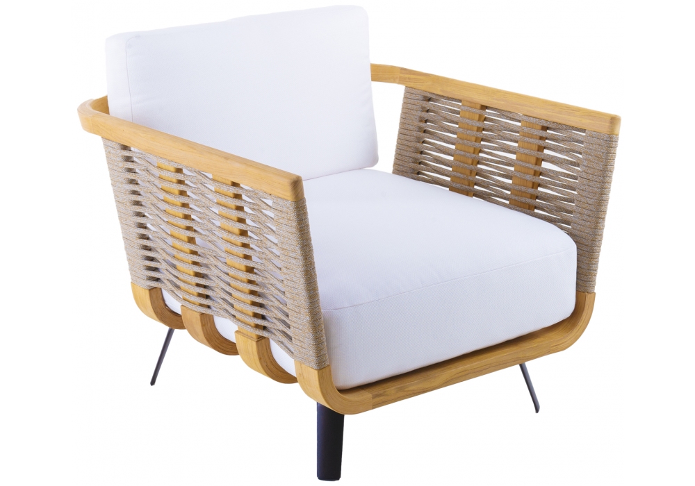 Welcome, entworfen und hergestellt von Unopiù, ist ein Sessel mit Struktur aus Teakholz oder Teakholz und Seil. Die Sitzkissen bestehen aus Acrylgewebe in verschiedenen Ausführungen. Welcome ist in verschiedenen Modellen erhältlich.