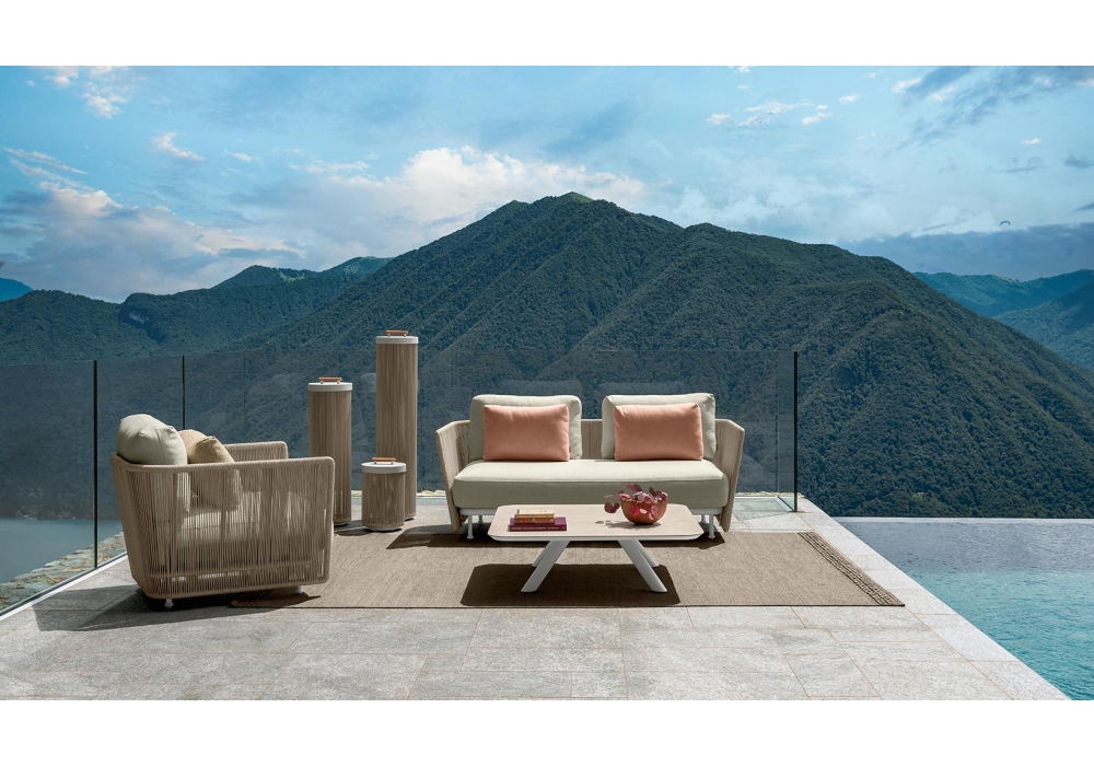 Coral von Marco Acerbis für Talenti entworfen, ist ein Outdoor-Sessel mit Struktur aus pulverbeschichtetem Aluminium. Rückenlehnenstruktur mit einem synthetischen Seilgewebe bezogen. Die Kissen haben abnehmbare Bezüge und sind mit wetterbeständigen Outdoor-Stoffen bezogen.