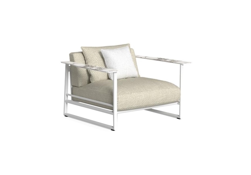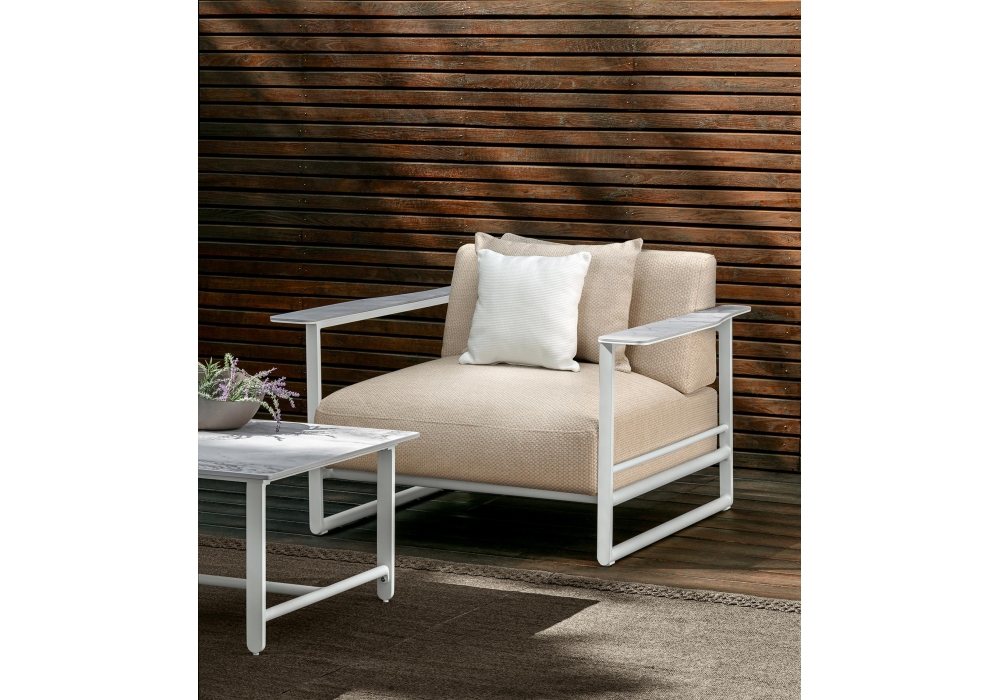Riviera von Jean Philippe Nuel für Talenti entworfen, ist ein Outdoor-Sessel mit Struktur aus pulverbeschichtetem Aluminium, Armlehnen mit Steinzeugeinsatz. Die Kissen haben abnehmbare Bezüge und sind mit wetterbeständigen Outdoor-Stoffen bezogen.