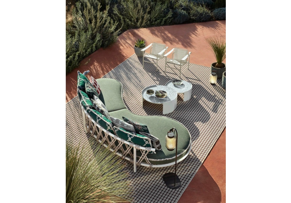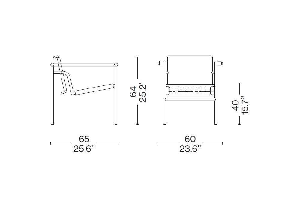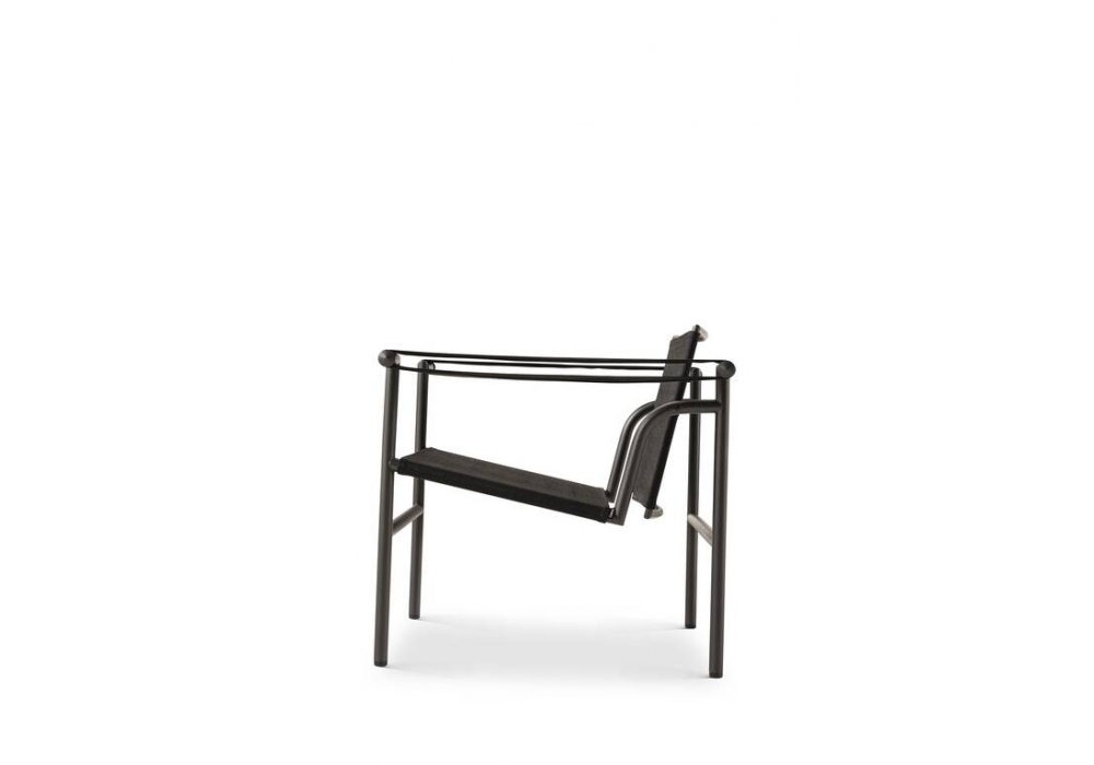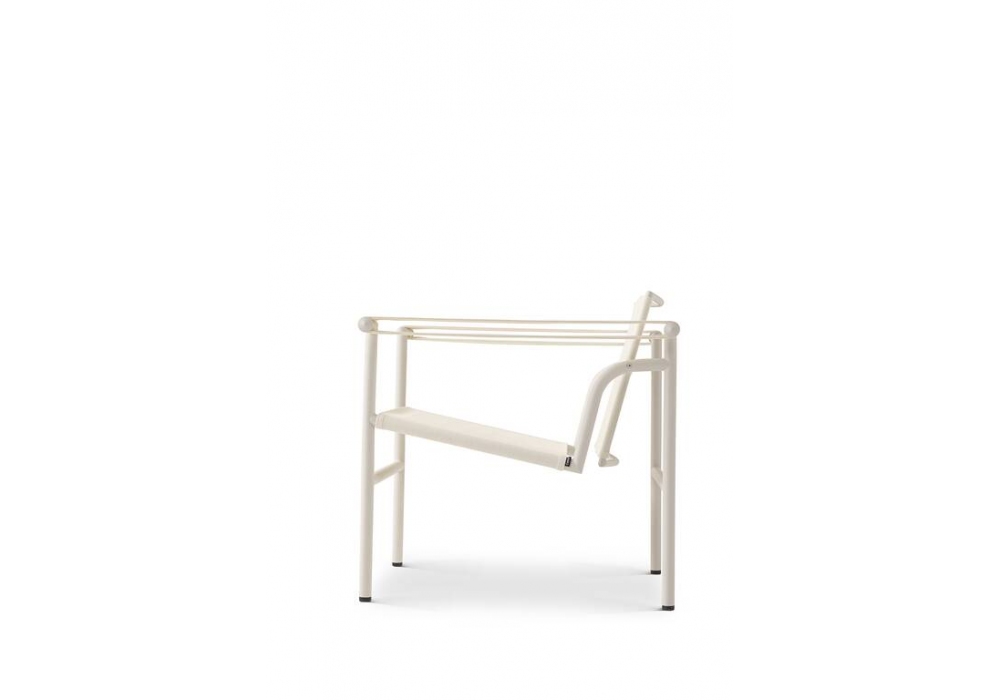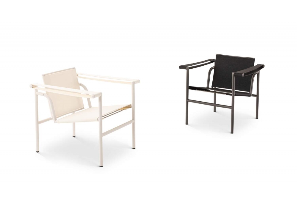 1 Fauteuil Dossier Basculant, Outdoor von Le Corbusier, Pierre Jeanneret und Charlotte Perriand für Cassina entworfen, ist ein Armstuhl mit einer Struktur aus lackiertem Edelstahl und Stoffbezug.