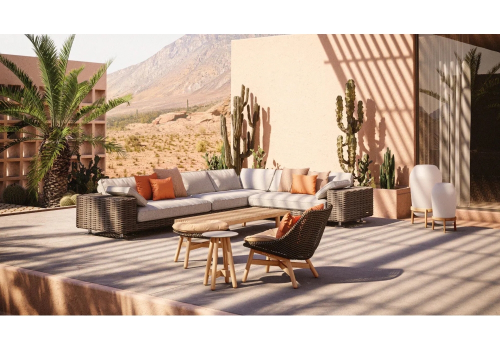 Die von Sebastian Herkner für Dedon entworfene Mbrace-Kollektion ist in verschiedenen Materialien erhältlich. Die Sitze bestehen aus DEDON-Faser, die über einen Aluminiumrahmen gewebt ist, während die Basen aus hochwertigem Teakholz bestehen. Dieses schöne, langsam wachsende Holz, reich an natürlichen Tanninölen, bietet eine hervorragende Haltbarkeit bei extremen Wetterbedingungen. Die Kissen sind gesteppt, wodurch die Füllung an Ort und Stelle bleibt und die Langlebigkeit ihrer luxuriösen Umarmung unterstützt wird.