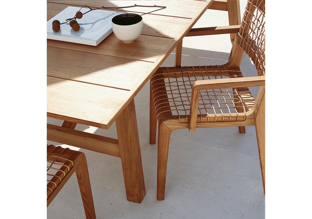 Synthesis hergestellt und entworfen von Unopiù, ist ein Armstuhl mit Struktur aus natürlichem Teakholz und geflochtenem Waprolace-Seil. Die Kissen sind aus Acrylgewebe in verschiedenen Farben erhältlich.
