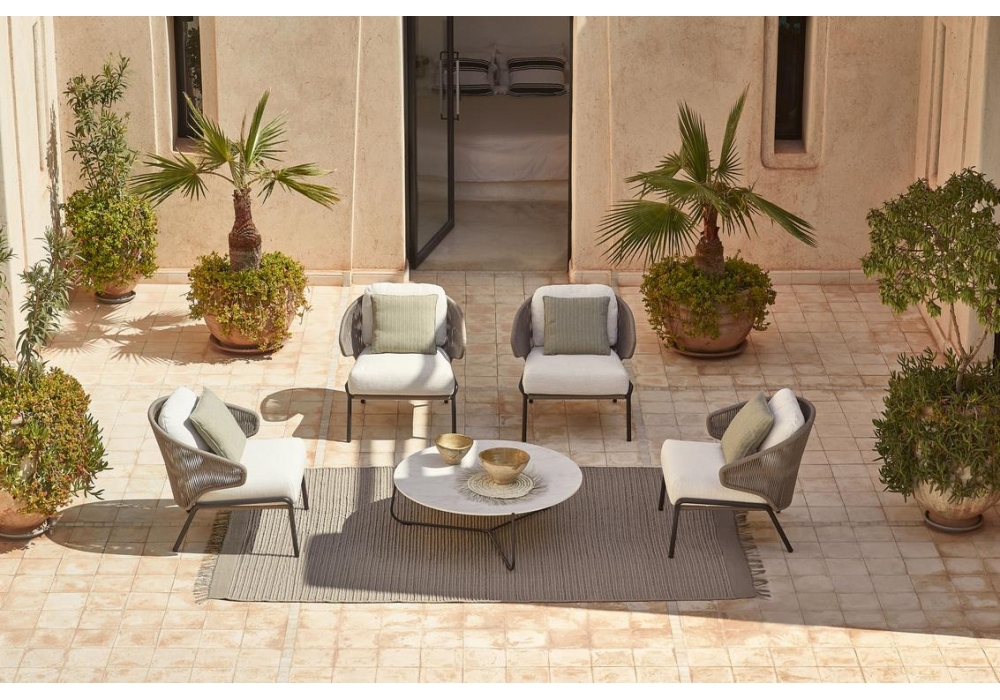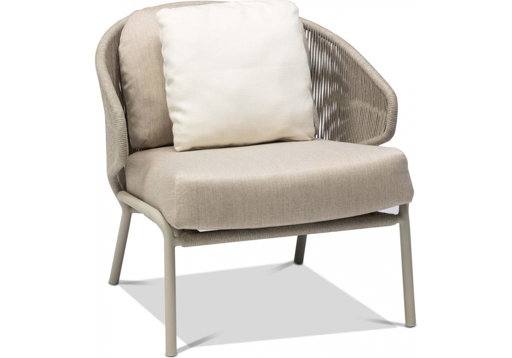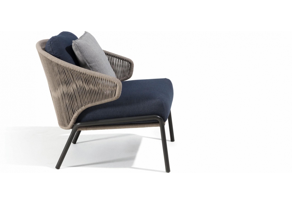 Radius, von Stephane De Winter für Manutti entworfen, ist ein Outdoor-Sessel mit einer Edelstahlstruktur und gewebtem Seil. Polsterung der Kissen in Stoff. Erhältlich in verschiedenen Ausführungen.