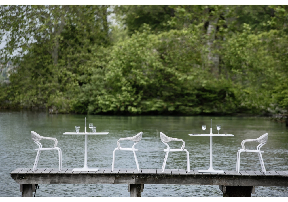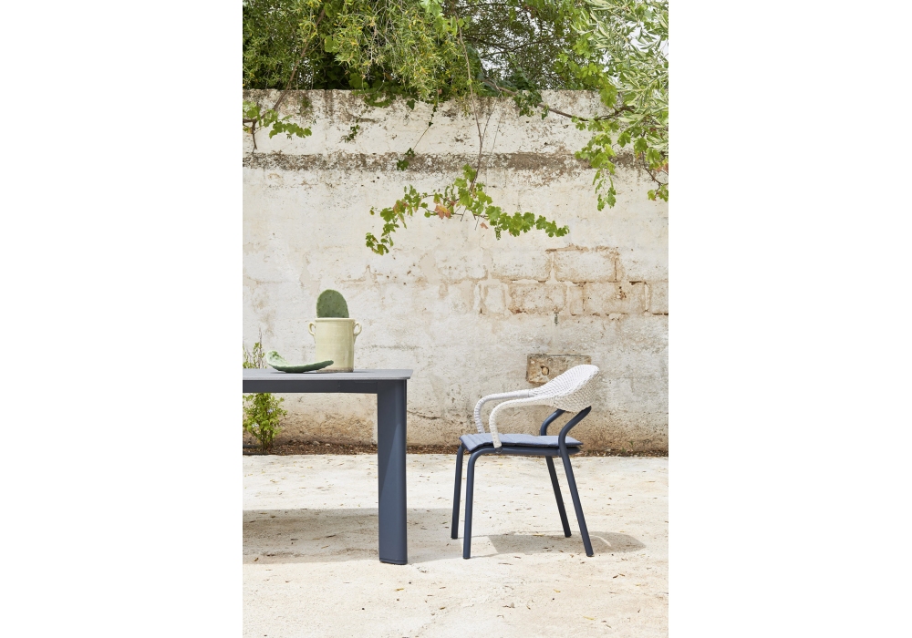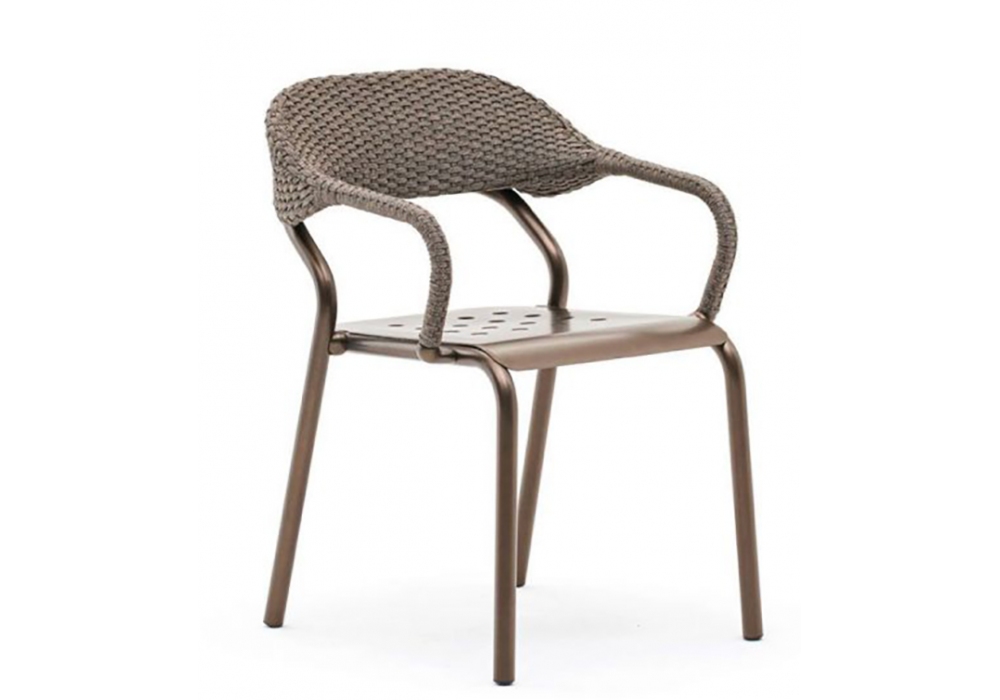 Noss, von Edoardo Gherardi für Varaschin entworfen, ist ein kleiner Sessel mit Struktur aus Aluminiumrohr und Sitz aus pulverbeschichtetem dickem Aluminiumblech. Handgeflochtene Rückenlehne mit Kunstfaserseil. Optionales Kissen mit Outdoor-Polsterung. Erhältlich in verschiedenen Ausführungen.