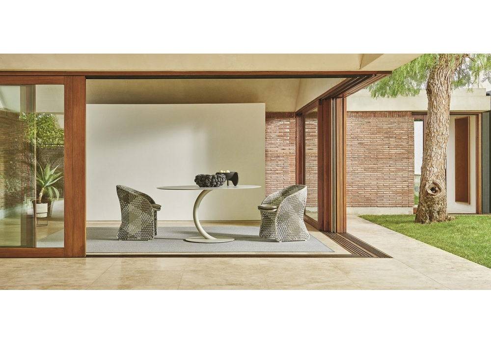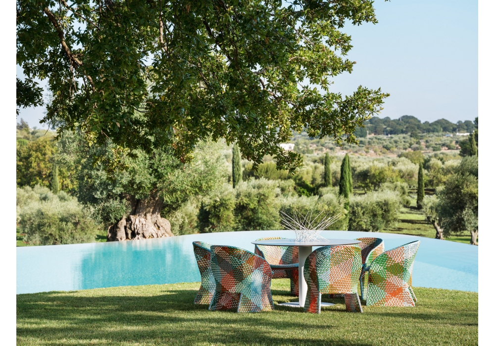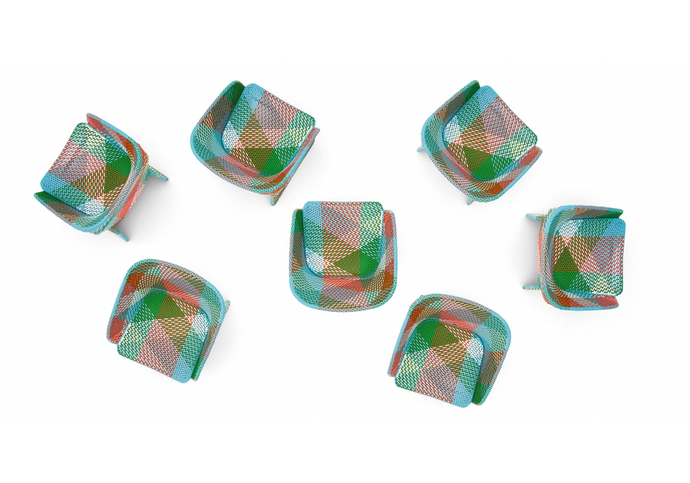 Maat von Philippe Bestenheider für Varaschin entworfen, ist ein handgewebter Sessel aus Kunstfaser mit Gestell aus pulverbeschichtetem Aluminium. Erhältlich in verschiedenen Ausführungen.