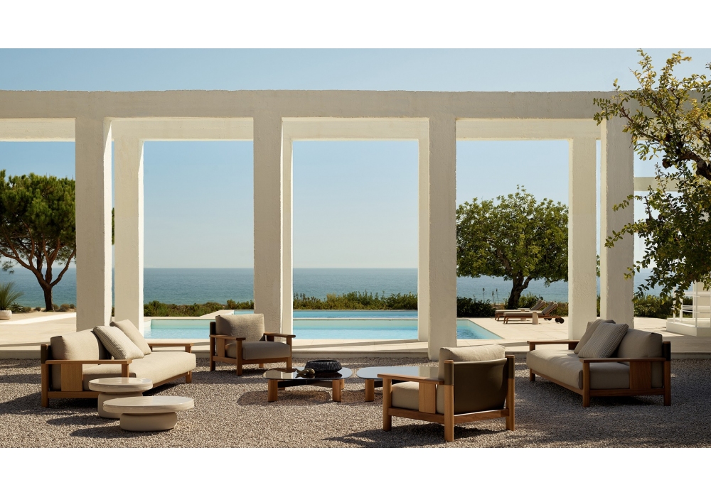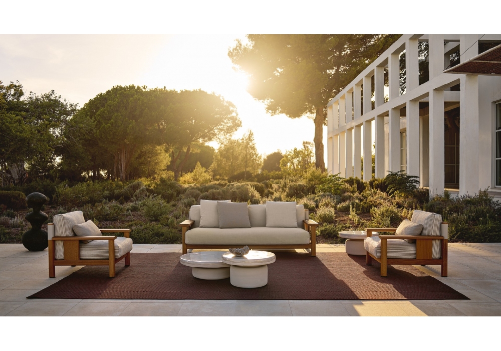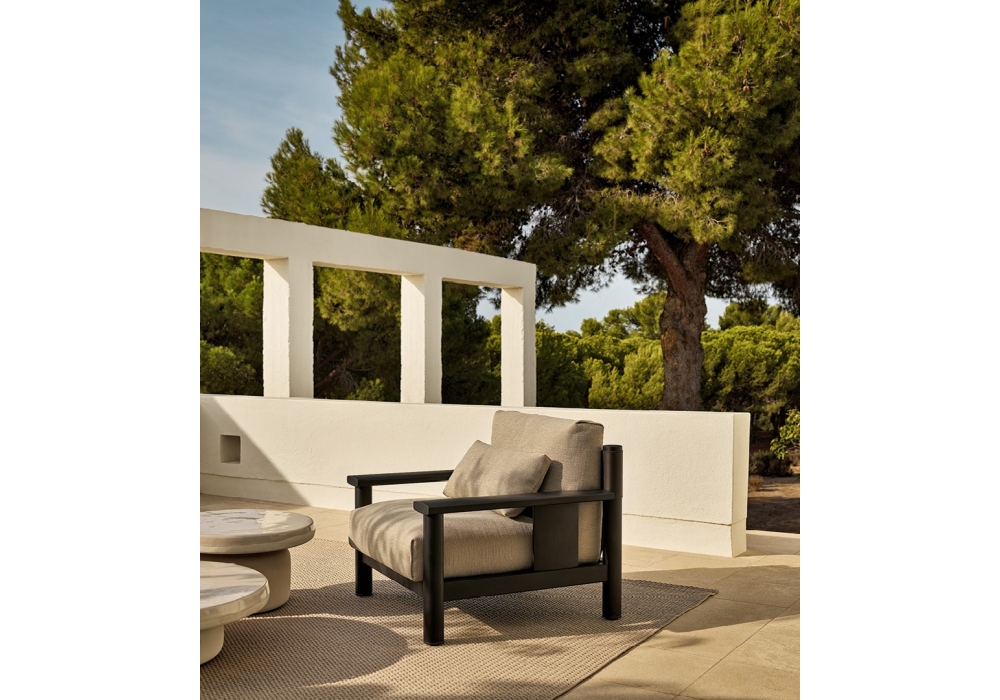 Ketch von Jean Marie Massaud für Poliform entworfen, ist ein Sessel mit Struktur aus massivem Iroko natur oder schwarz gebeiztem Iroko mit Rückenlehne aus farbig gebeiztem EVA. Sitz- und Rückenkissen aus recyceltem PET-Polyester mit Polyurethan-Einlage. Nierenkissen aus Polyurethan. Vorbespannung aus Polyesterfaser mit heißversiegelten Nähten. Dekorative Kordelnähte mit farbigem Garn. Abnehmbarer Stoffbezug.