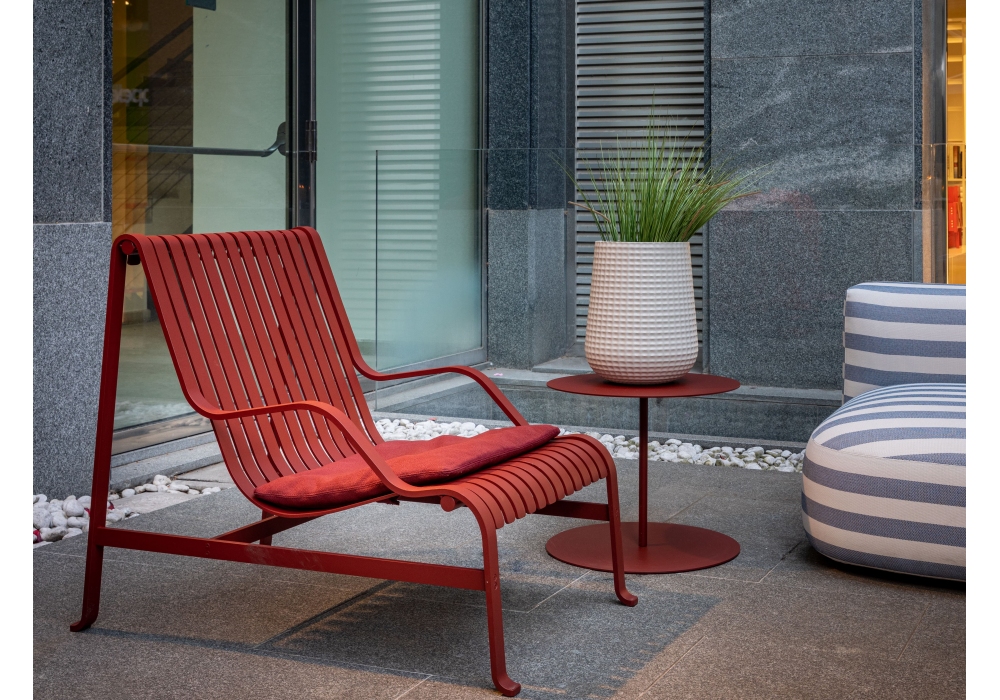 Vendicari Lido von Jangir Maddadi für Cappellini entworfen, ist ein Outdoor-Sessel mit Armlehnen aus flachen Aluminiumprofilen und Stützstangen. Geprägte Pulverbeschichtung. Sitzkissen aus Polyesterwatte mit wasserabweisendem Futter, auf Anfrage.