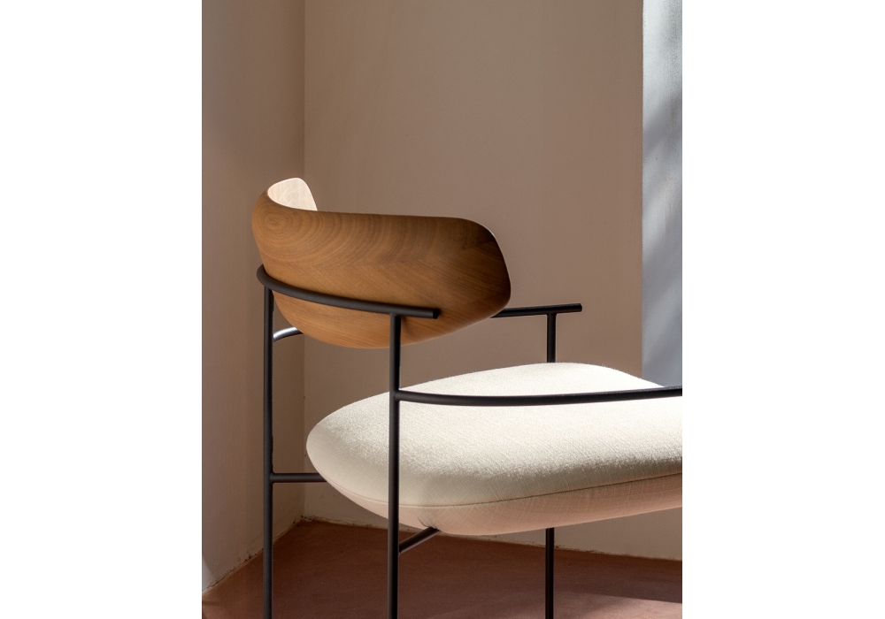 Keel Outdoor, von M + V für Potocco entworfen, ist ein Outdoor-Sessel mit Metallstangenstruktur und massiver Iroko-Rückenlehne. Der Sitz ist gepolstert und mit verschiedenen Outdoor-Stoffausführungen bezogen.