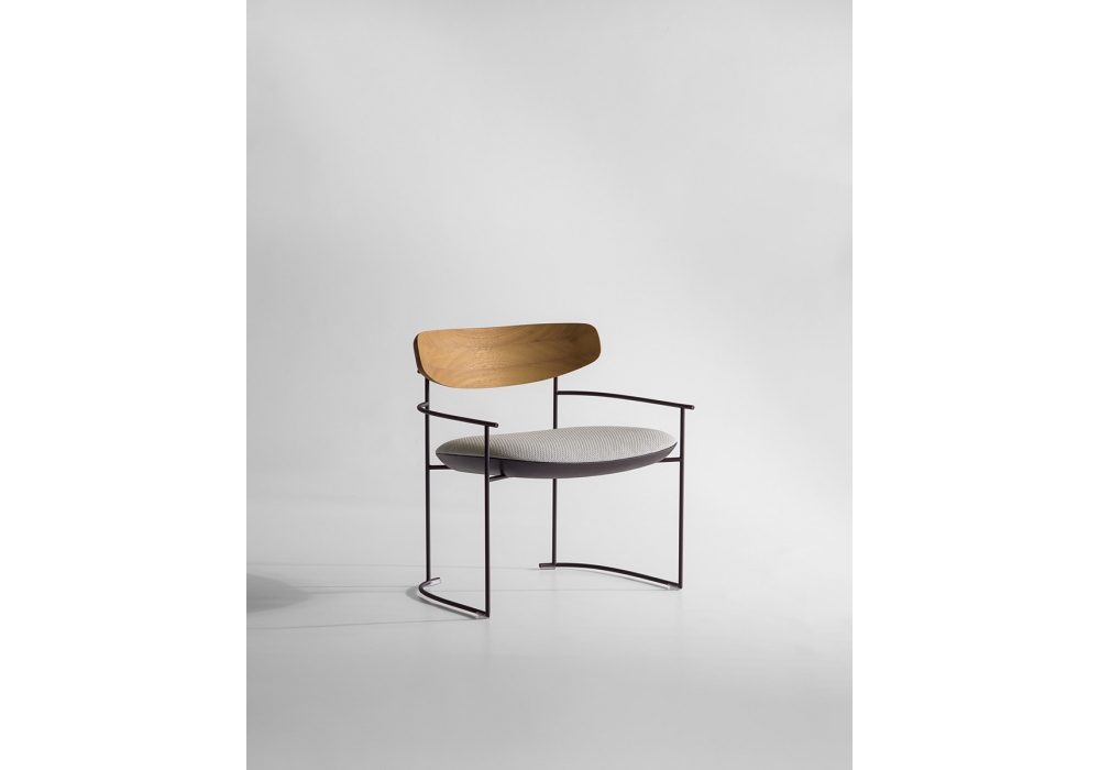 Keel Light Outdoor von M + V für Potocco entworfen, ist ein Sessel mit einer Struktur aus geprägtem, lackiertem Metallstab, einer Rückenlehne aus massivem Iroko und einem Sitz mit feuerhemmendem Polyurethanschaum, der mit verschiedenen Stoffen gepolstert ist, mit darunter liegender, starrer, mit Acryl lackierter Schale für den Außenbereich Farbe und feine Prägung wie der Schaft.