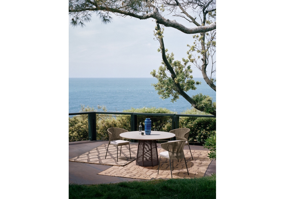 Ola von Radice Orlandini für Potocco entworfen, ist ein Outdoor-Esszimmer-Sessel mit Rückenlehne aus handgeflochtenem, pulverbeschichtetem Outdoor-Metallstab mit „Fly“-Band. Das Sitzkissen ist mit feuerhemmendem Polyurethanschaum und Polyesterwatte gepolstert; die Stoffunterlage ist wasserdicht mit versiegelten Nähten; Abschlussfutter aus Outdoor-Stoffen.