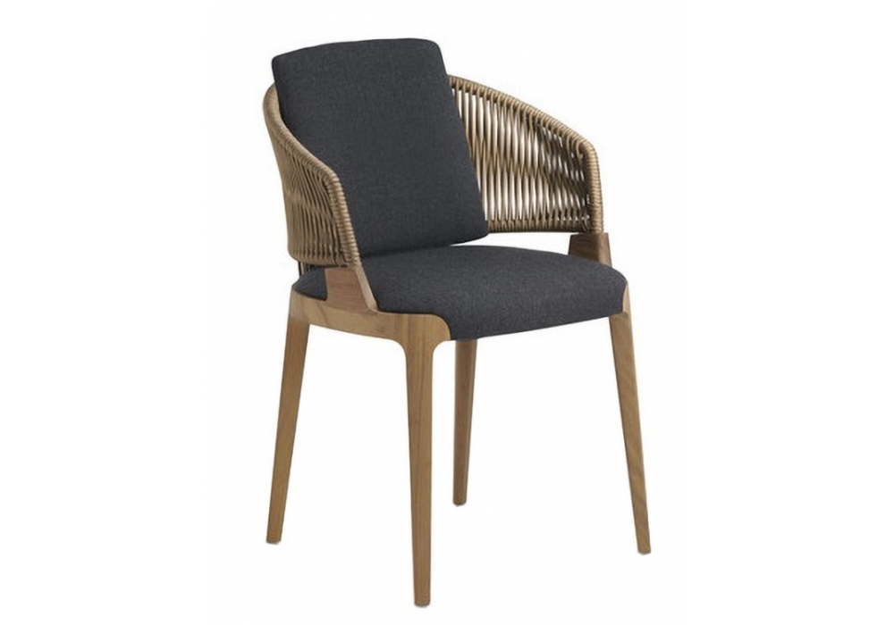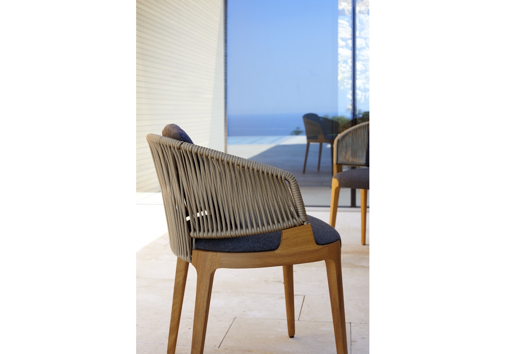 Velis von Mario Ferrarini für Potocco entworfen, ist ein Outdoor-Cockpit-Sessel mit Gestell aus massivem Iroko und Rückenlehne mit lackierter Metallstruktur, handgeflochten aus „Gassa“-Kordel oder nautischem Hanfseil, Sitz mit feuerhemmendem Polyurethanschaum gepolstert und mit Oberflächen und Outdoor-Kollektionen gepolstert Beläge.