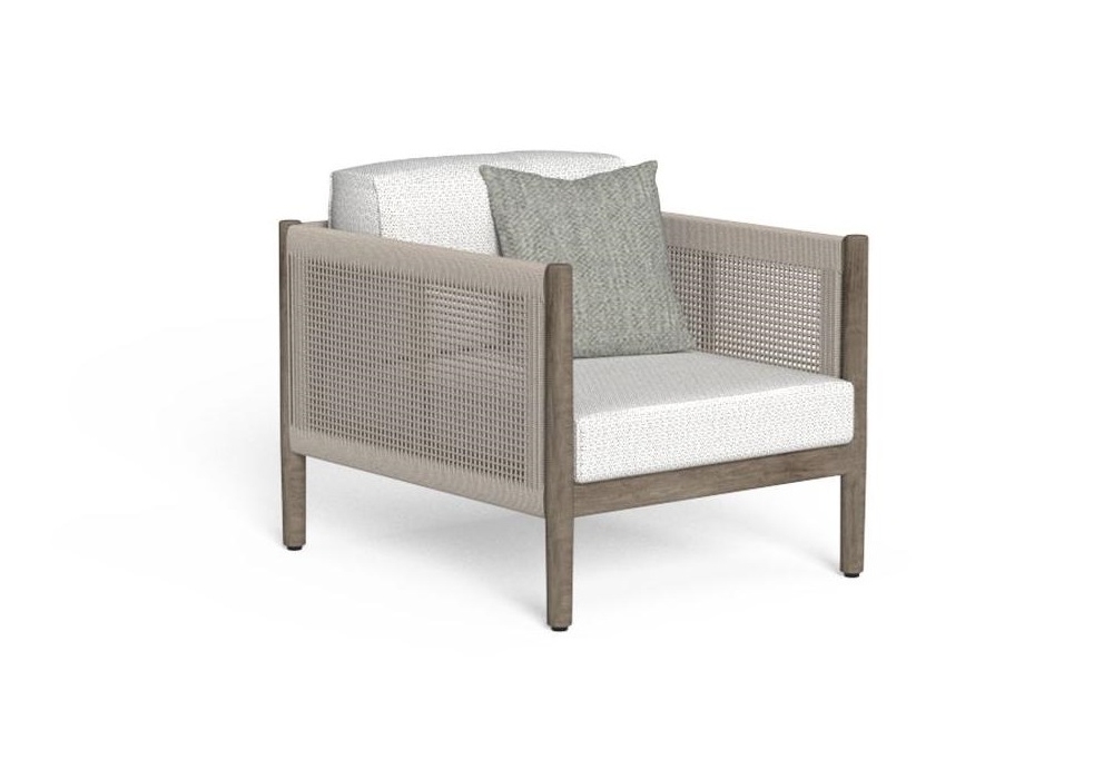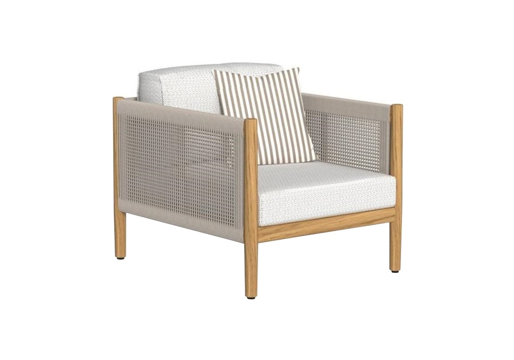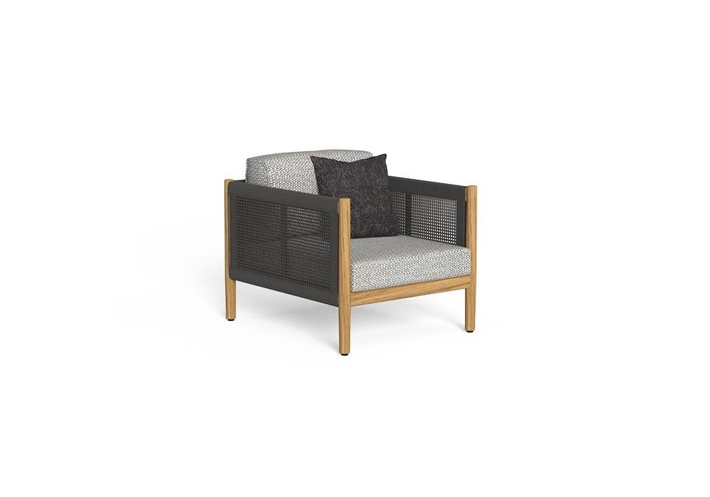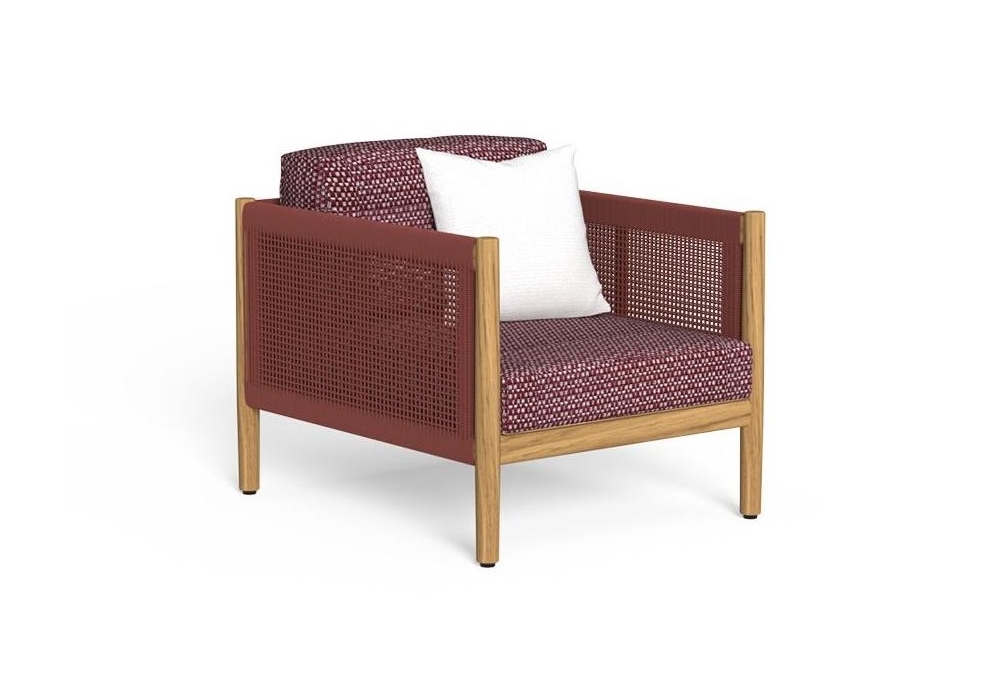 Dolcevita von Talenti entworfen, ist ein Sessel mit Holzgestell, Seiten- und Rückenlehne aus gepolstertem Synthetikseil, gepolsterten Sitzkissen und Rückenlehne mit Stoffbezug. Erhältlich in verschiedenen Ausführungen.
