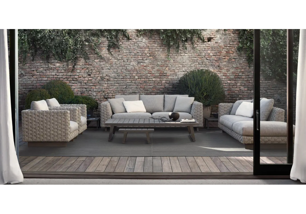 Ray Outdoor Natural von Antonio Citterio für B&B Italia Outdoor entworfen ist ein Sessel mit einer Sitzschale aus naturfarbenem Textilene-Geflecht und anthrazitfarben lackierten Aluminiumfüßen. Stoffpolsterung in verschiedenen Ausführungen und Basis aus antikem grauem Teakholz.