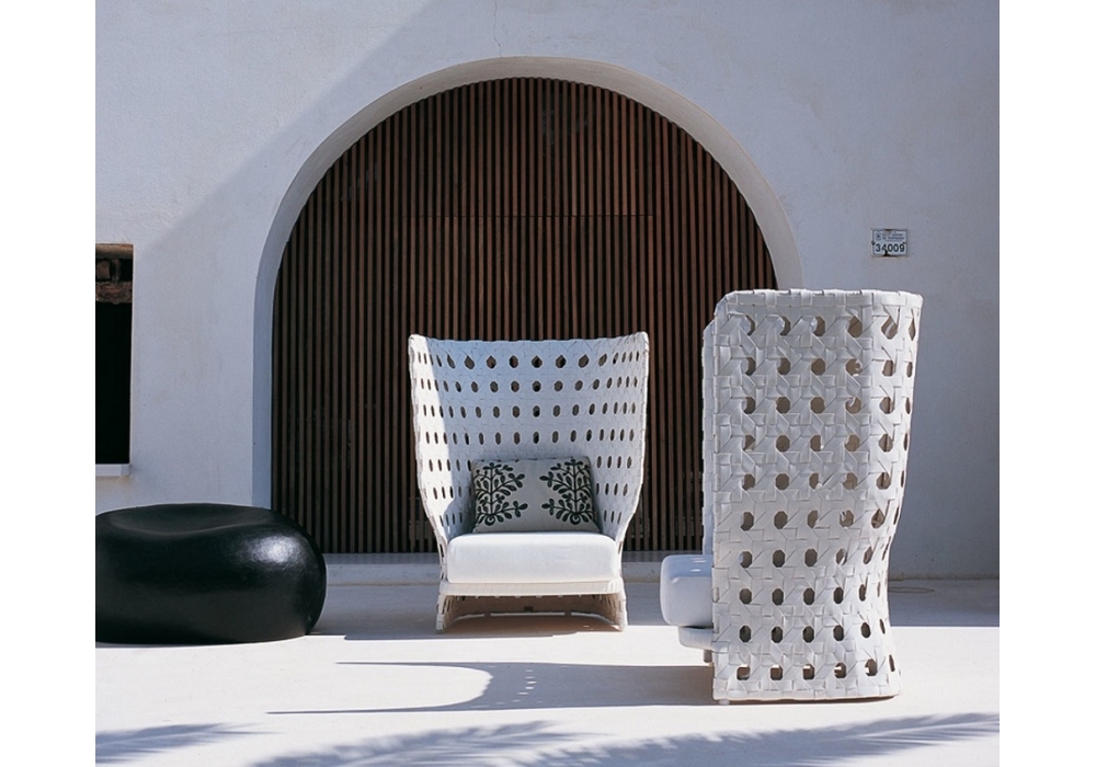 Canasta von Patricia Urquiola für B&B Italia Outdoor entworfen, ist ein Sessel mit niedriger Rückenlehne mit einem weiß lackierten Aluminiumrahmen und einem weißen Polyethylenfasergeflecht. Sitzpolsterung in verschiedenen Stoffen.