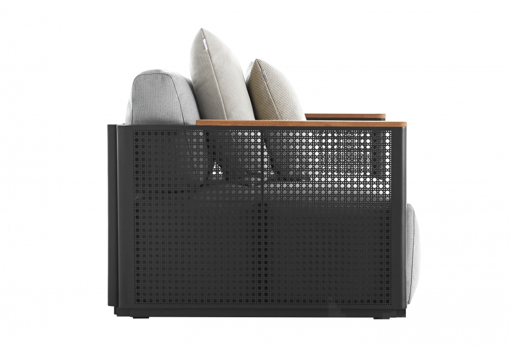 Bosc von Made Studio für Gandia Blasco entworfen, ist ein Designer-Loungesessel aus pulverbeschichtetem, geschweißtem Aluminium und mikroperforiertem Blech mit handgefertigten Korbmustern. Armlehne aus Iroko-Holz, Sitz, Rückenlehne und Kissen aus wiederverwendbarem Polyurethanschaum mit wasserabweisender Polyesterfaser. Verfügbar in verschiedenen Ausführungen. Kissen sind im Lieferumfang enthalten.