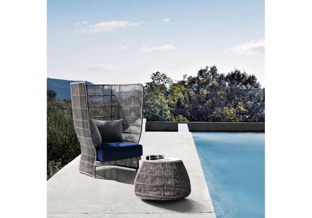 Canasta'13, von Patricia Urquiola für B&B Italia Outdoor entworfen, ist ein Sessel mit hohem oder niedrigem Rücken erhältlich. Gestell aus Tortora-Polyester-Aluminiumpulver und Interlacing aus Tortora-Polyethylen. Sitzkissen aus geformtem Polyurethan, Bezug aus wasserabweisender Polyesterfaser. Aderendhülsen aus thermoplastischem Material. Stoffbezug.