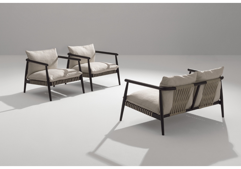 Karin, entworfen von Setsu & Shinobu Ito für Désirée, ist ein Outdoor-Sessel, der die Indoor-Kollektion für den Außenbereich neu interpretiert. Die Iroko-Holzstruktur verbindet sich mit der handwerklichen Flechtung von Sitz und Rückenlehne und schafft einen harmonischen Dialog zwischen Materialien und Verarbeitung. Weiche Formen und die Leichtigkeit des Gesamterscheinungsbildes definieren einen natürlichen und entspannten Komfort. Die Kollektion umfasst Sessel, kleinen Sessel und Sofa und bildet ein flexibles und stimmiges Möbelsystem.