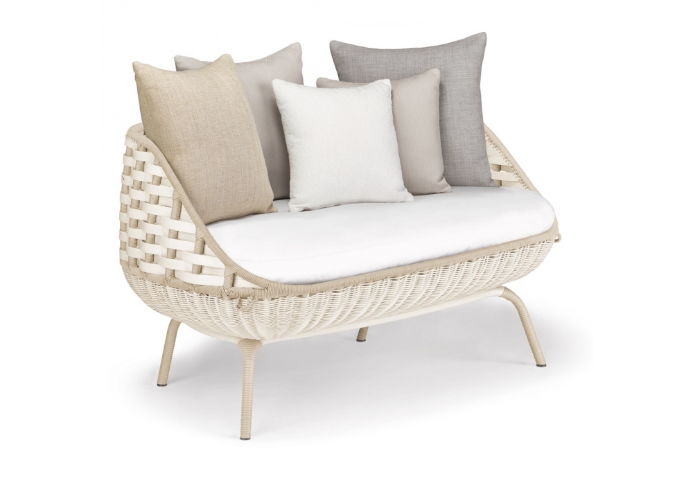 Das von Daniel Pouzet für Dedon entworfene 2-Sitzer-Sofa SwingUs wurde für zwei Personen entworfen, ist jedoch geräumig genug, damit sich ein einzelner Benutzer in eine liegende Position kuscheln kann. Dieses bequeme Liebessitz verfügt über eine umlaufende Rückenlehne, die den Benutzer umhüllt. Das Dedon SwingUs 2-Sitzer-Sofa ist in zwei verschiedenen Faserfarben erhältlich: Kreide und Natur.