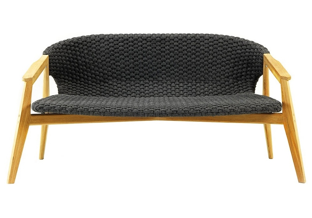 Knit von Patrick Norguet für Ethimo entworfen, ist ein Zweisitzer-Sofa mit Struktur aus natürlichem oder gebeiztem Teakholz, das mit Seil bespannt ist. Die Lendenkissen sind aus Acrylgewebe. Strick ist in verschiedenen Ausführungen erhältlich.