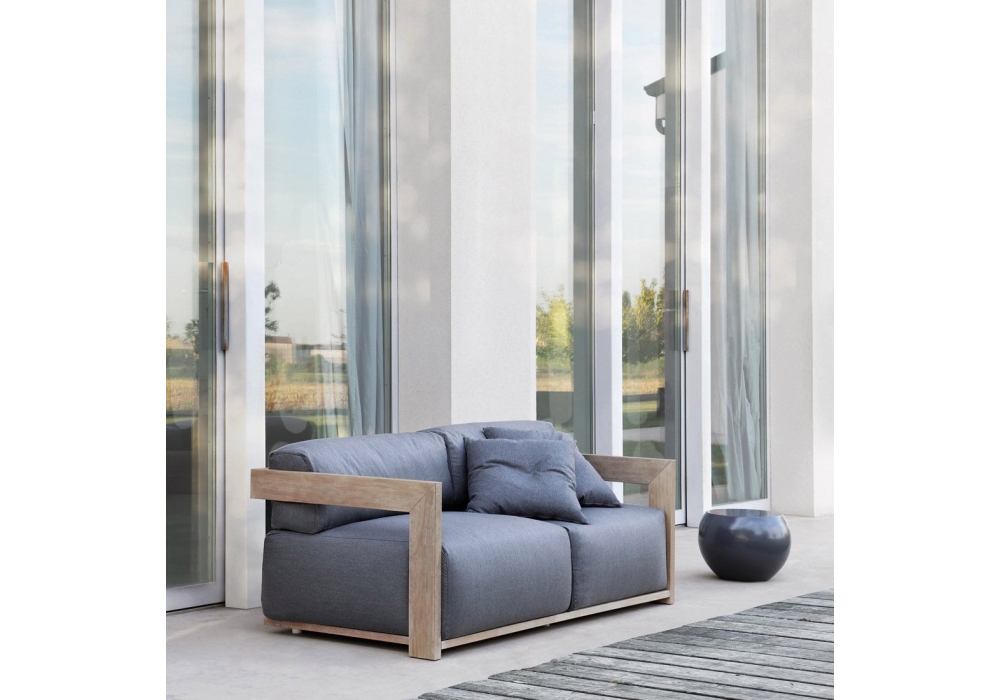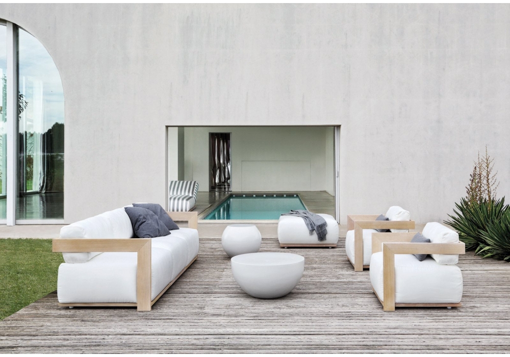 Claud Open Air von Andrea Parisio für Meridiani ist eine Sofa für den Außenbereich. Holzgestell aus gebleichtem Irokoholz und Kissen aus PU-Schäumen und Polyesterfaser.