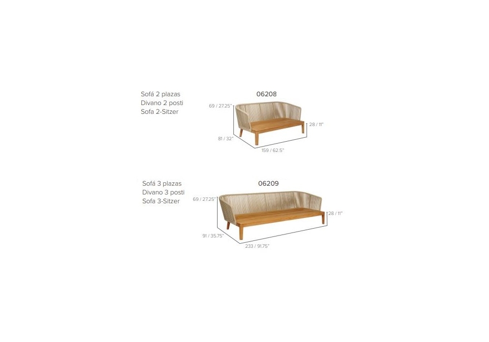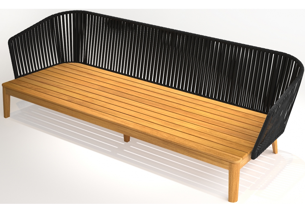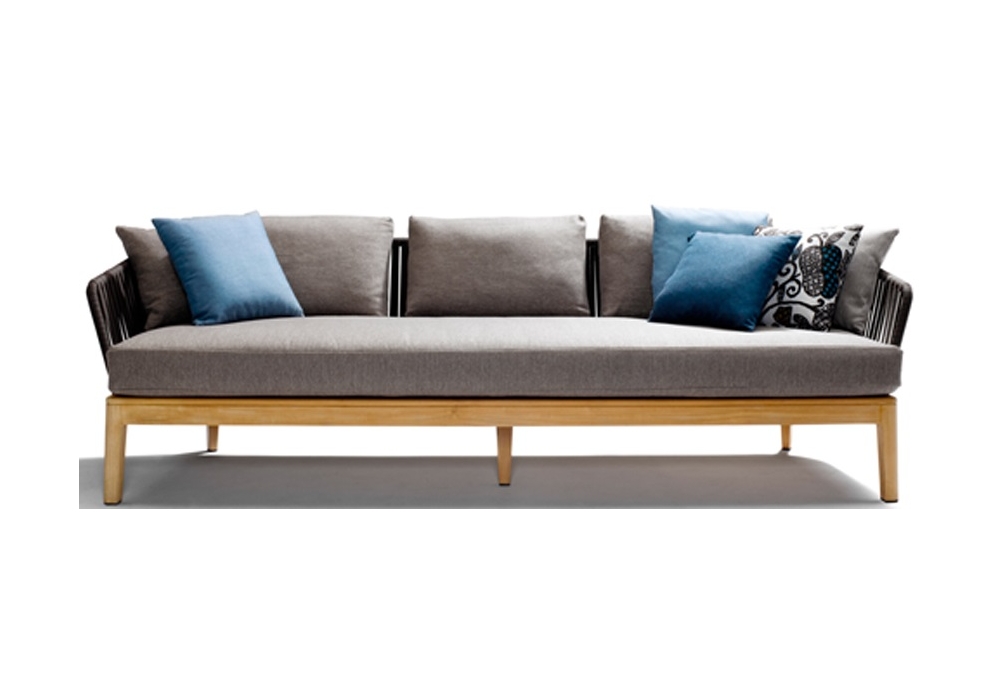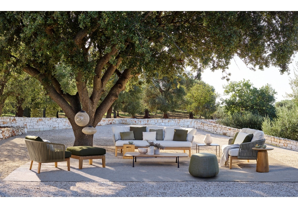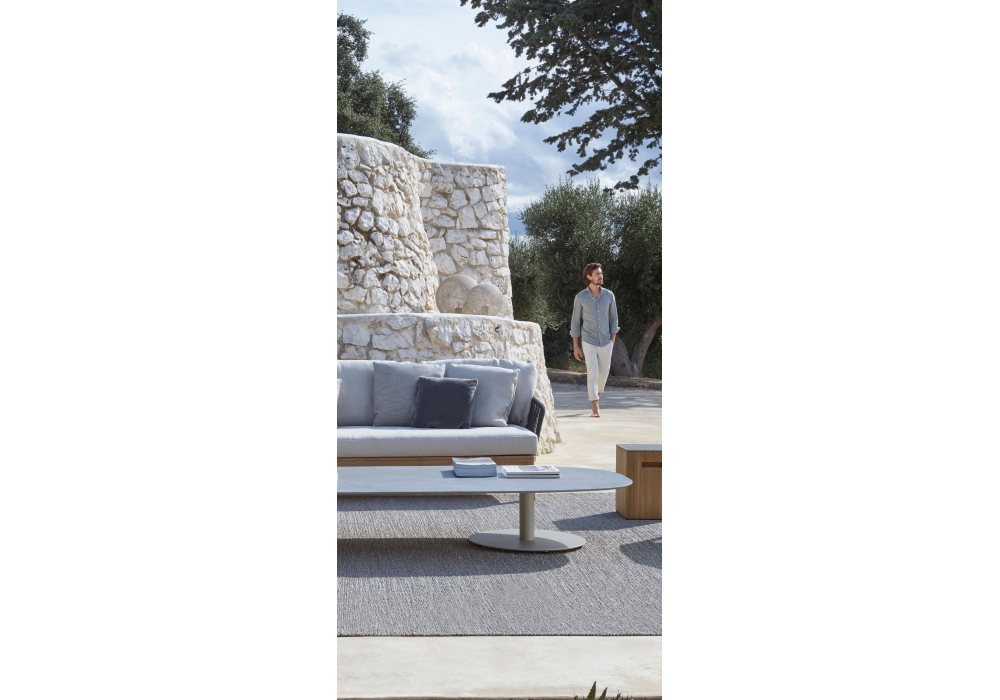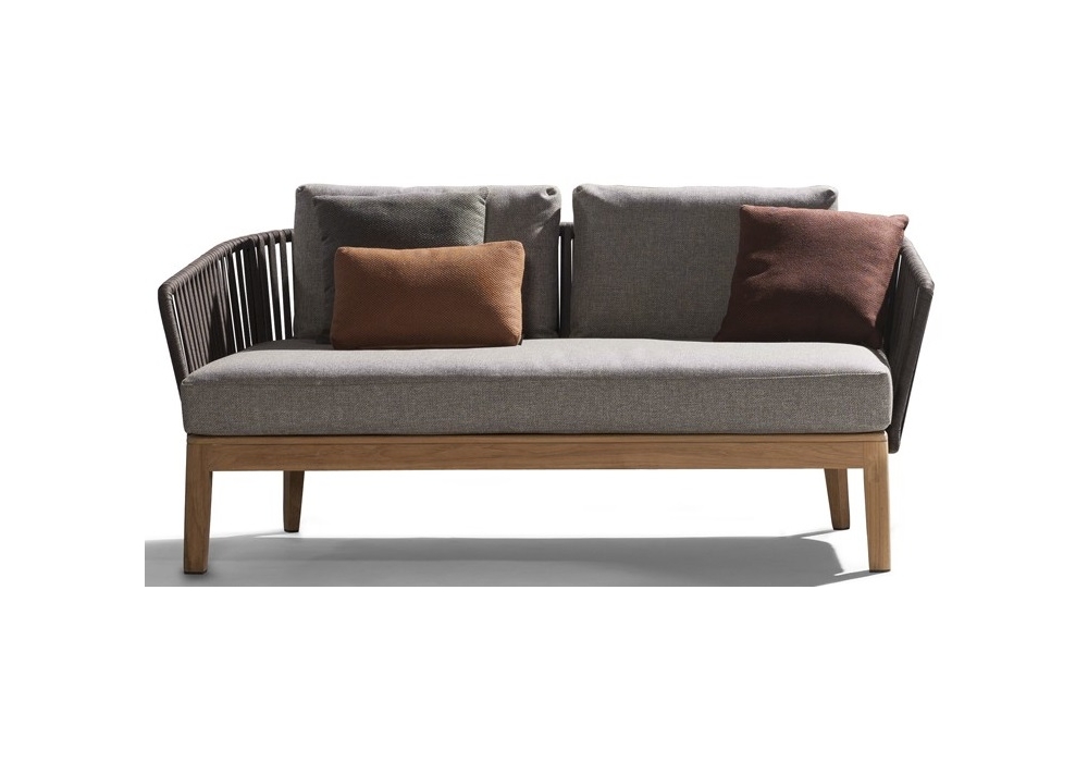 Mood, von Studio Segers für Tribù entworfen, ist ein Sofa mit Struktur aus Teakholz und Schale aus Tricord in verschiedenen Ausführungen. Das Sitzkissen ist gepolstert und mit verschiedenen Stoffen und Farben bezogen.