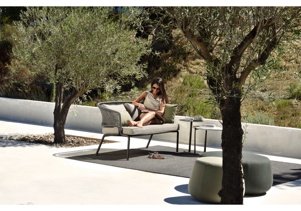 CTR von Piergiorgio Cazzaniga für Tribù entworfen, ist ein 2-Sitzer-Sofa mit Rahmen aus Rohrprofilen aus pulverbeschichtetem Edelstahl in verschiedenen Ausführungen. Die Schale besteht aus einem großmaschigen Gewebe, das in zwei Farben erhältlich ist. Die Sitzfläche ist mit einem vollständig wasserabweisenden Kissen bezogen, das abgenommen werden kann. Es ist möglich, Rückenkissen hinzuzufügen, die mit dem gleichen Stoff wie die Sitzfläche bezogen sind.