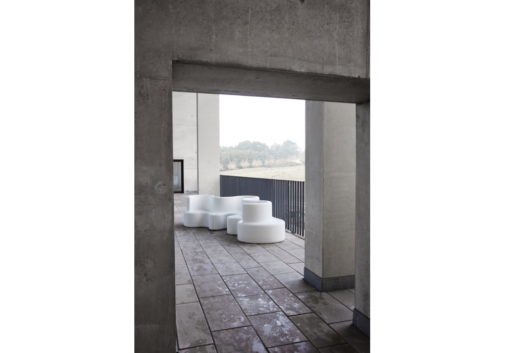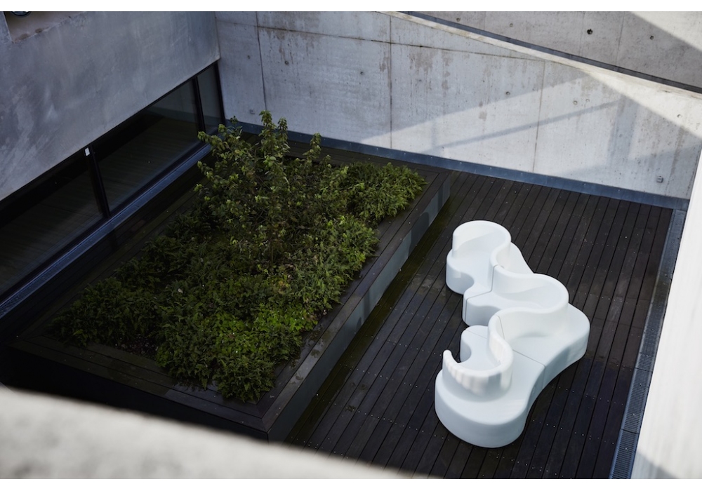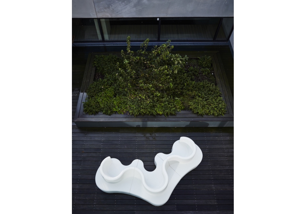 Cloverleaf Outdoor von Verner Panton für Verpan entworfen, ist ein modulares Outdoor-Sofa aus geformtem PE-Kunststoff, das aus drei Modulen besteht. Das Mittelteil und die Seitenteile lassen sich einfach nach dem Nut-und-Feder-Prinzip miteinander verbinden. Auf Anfrage ist es möglich, eine Ladeeinheit hinzuzufügen (nur für den Innenbereich).