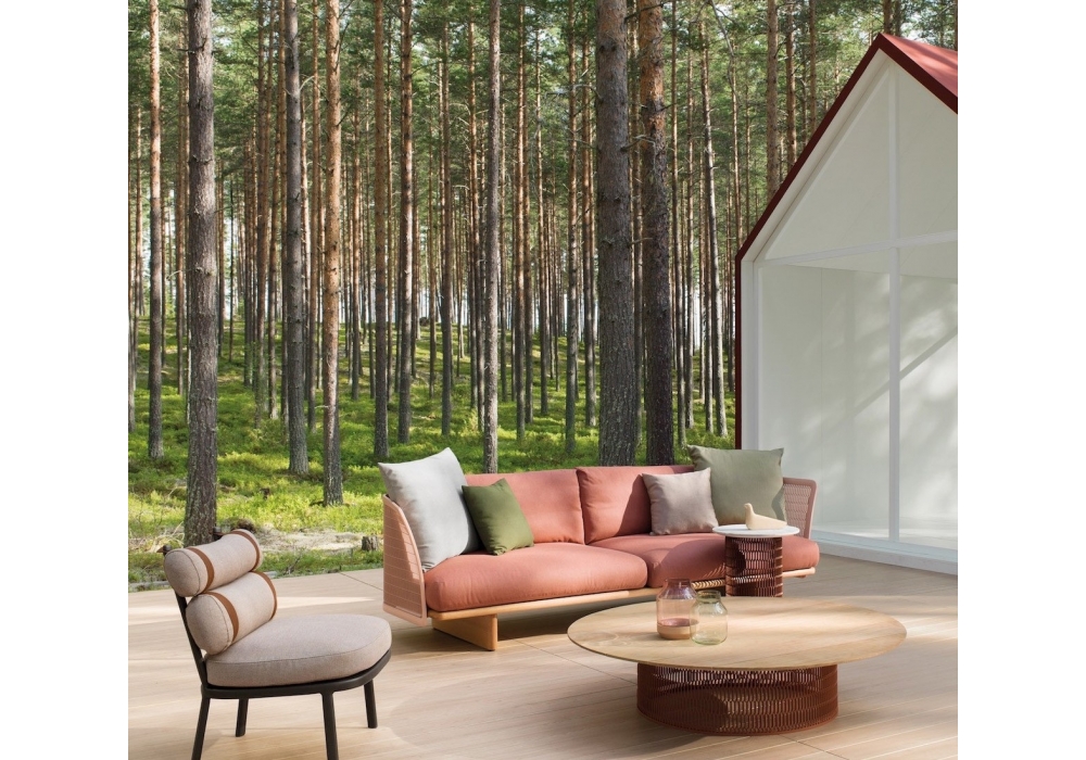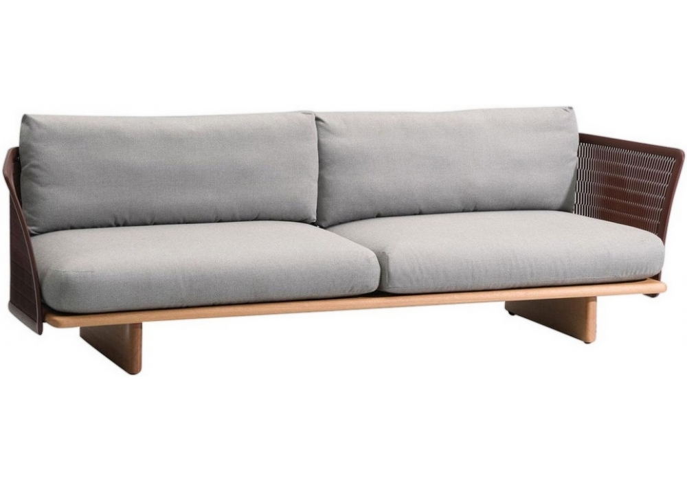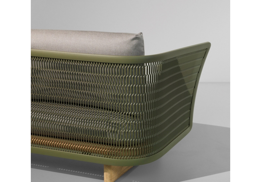 Mesh von Patricia Urquiola für Kettal entworfen ist ein 3-Sitzer-Sofa für den Außenbereich mit einer Basis aus Teakholz und einer Aluminiumstruktur. Die Kissen sind mit Stoffbezügen in verschiedenen Ausführungen gepolstert. Modulare Konfigurationen sind auf Anfrage möglich.
