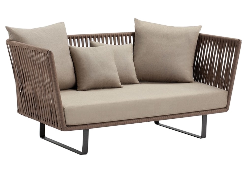 Bitta von Rodolfo Dordoni für Kettal entworfen ist ein 2-Sitzer-Sofa mit einem Gestell aus lackiertem Aluminium und einer Basis aus lackiertem Aluminium oder natürlichem Teakholz. Die Schale ist vollständig mit synthetischem Seil mit gepolsterten Kissen bedeckt und mit Stoff bezogen, der für den Außenbereich geeignet ist. Bitta ist in verschiedenen Ausführungen erhältlich.