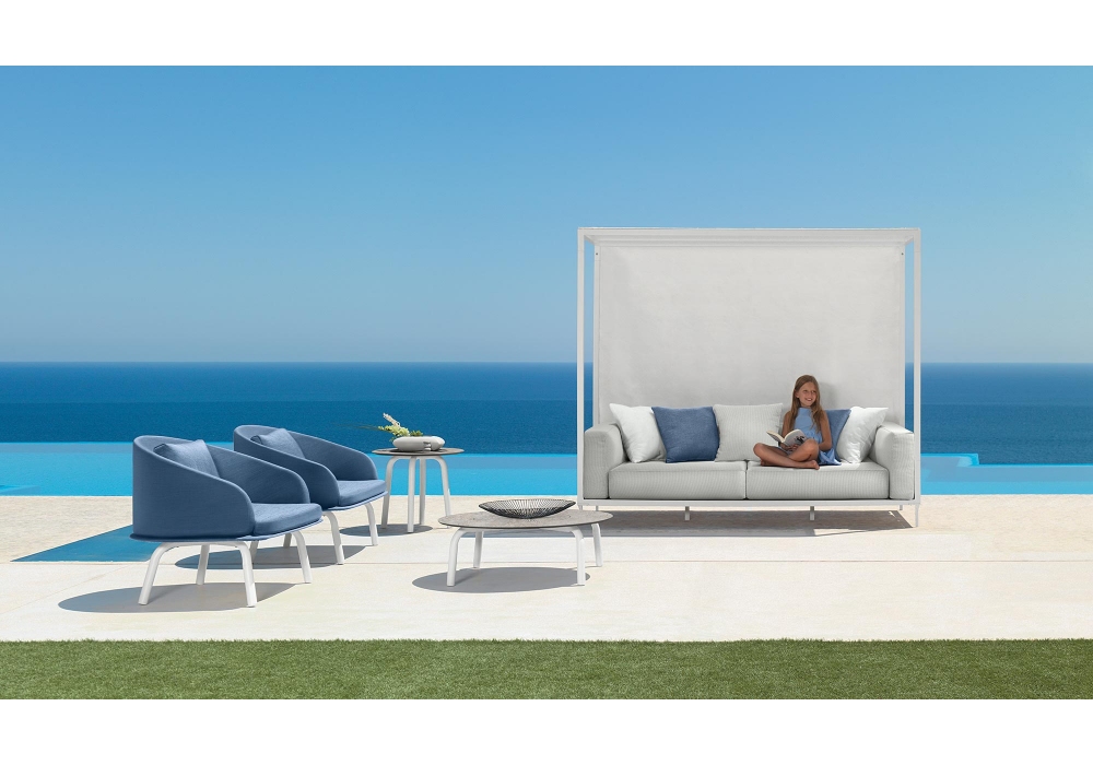 Cleosoft//Alu von Marco Acerbis für Talenti entworfen, ist ein Himmelsofa mit Aluminiumstruktur und Stoffbezug. Erhältlich in verschiedenen Ausführungen.