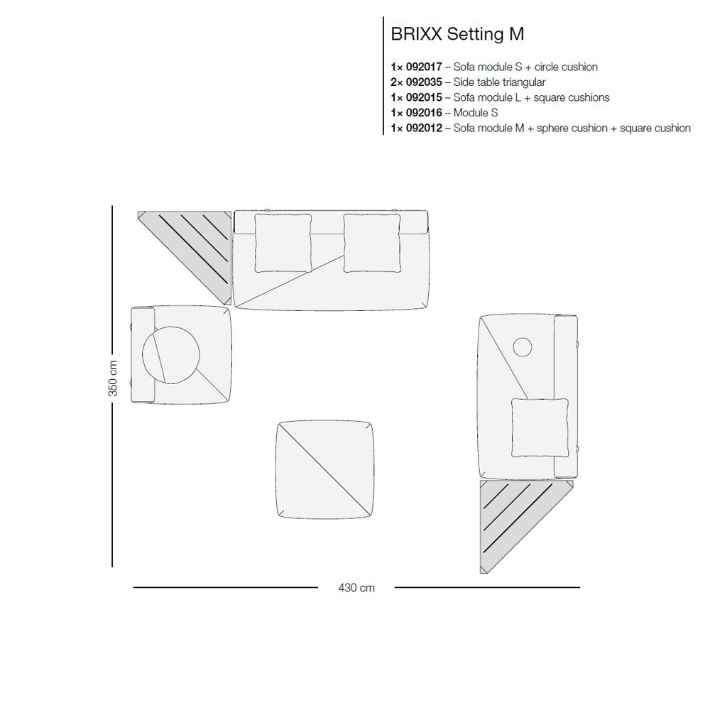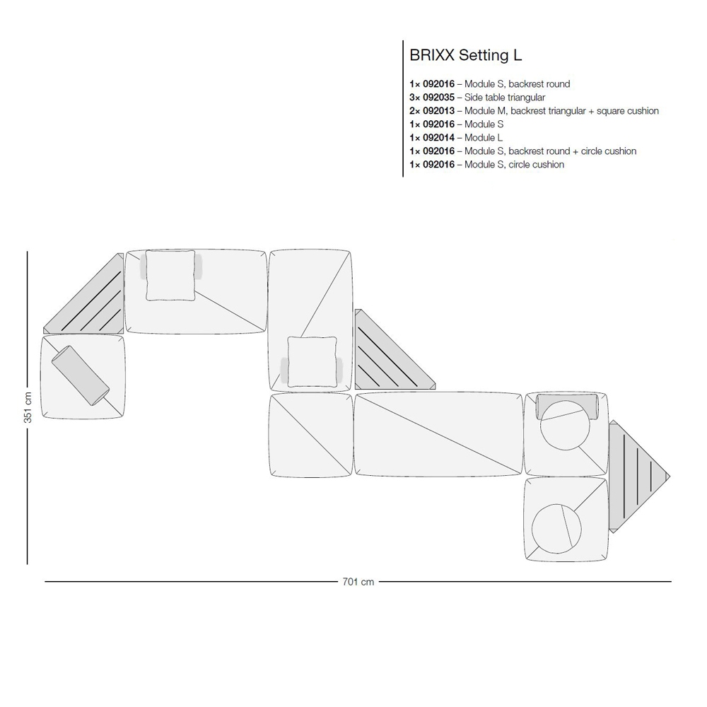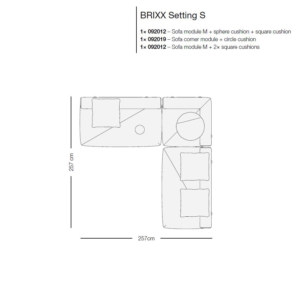 Brixx, entworfen von Lorenza Bozzoli für Dedon, ist ein modulares Systemsofa. Die Struktur besteht aus pulverbeschichtetem Stahl, der mit geformtem Polyurethanschaum ummantelt ist. Der Sitz und die Rückenlehne sind in verschiedenen Stoffausführungen erhältlich.