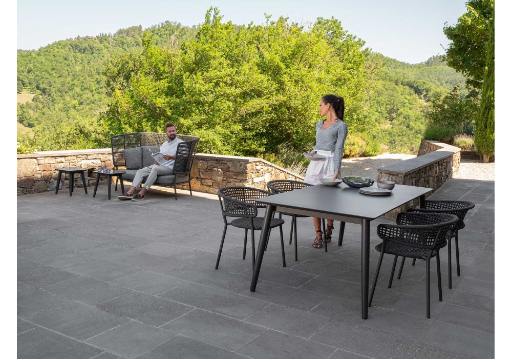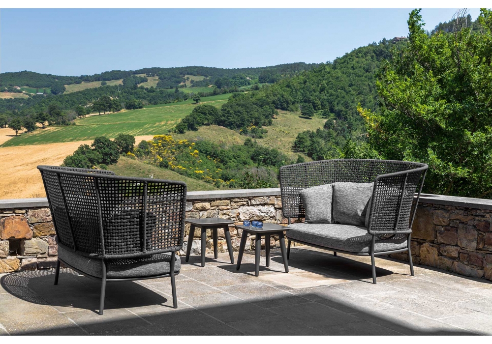 Mond Alu Love Seat entworfen von Cristian Visentin für Talenti ist ein Sofa aus der Kollektion Moon ist die perfekte Lösung, um Ihren Platz im Freien, Aluminium und Seilstruktur mit Sitz und Kissen in trockenem Schaum Stoff zu liefern.