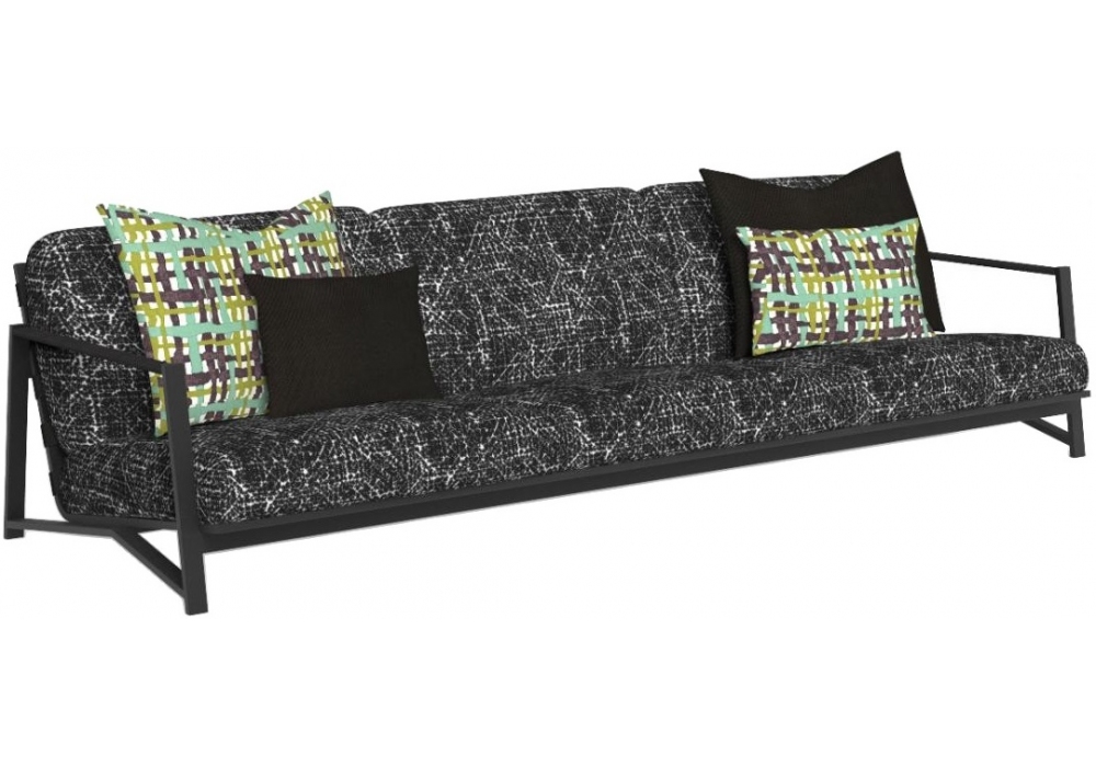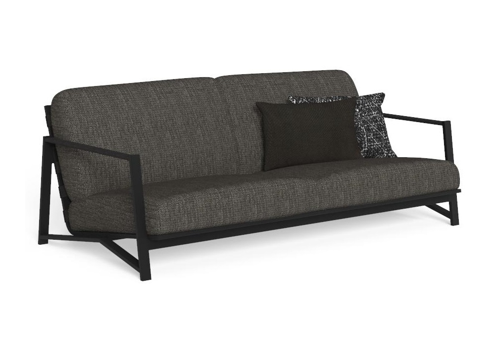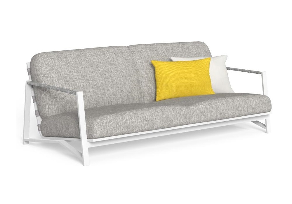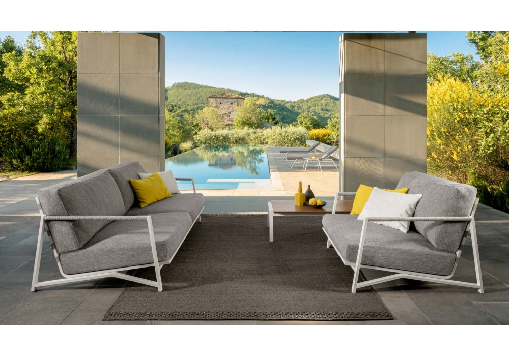 Cottage Luxury entworfen von Ramón Esteve für Talenti ist ein Sofa mit drei und zwei Sitzen. Pulverbeschichtete Aluminiumstruktur in Weiß oder Graphit und drei Stoffoberflächen des Sitzes.