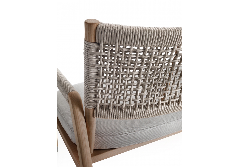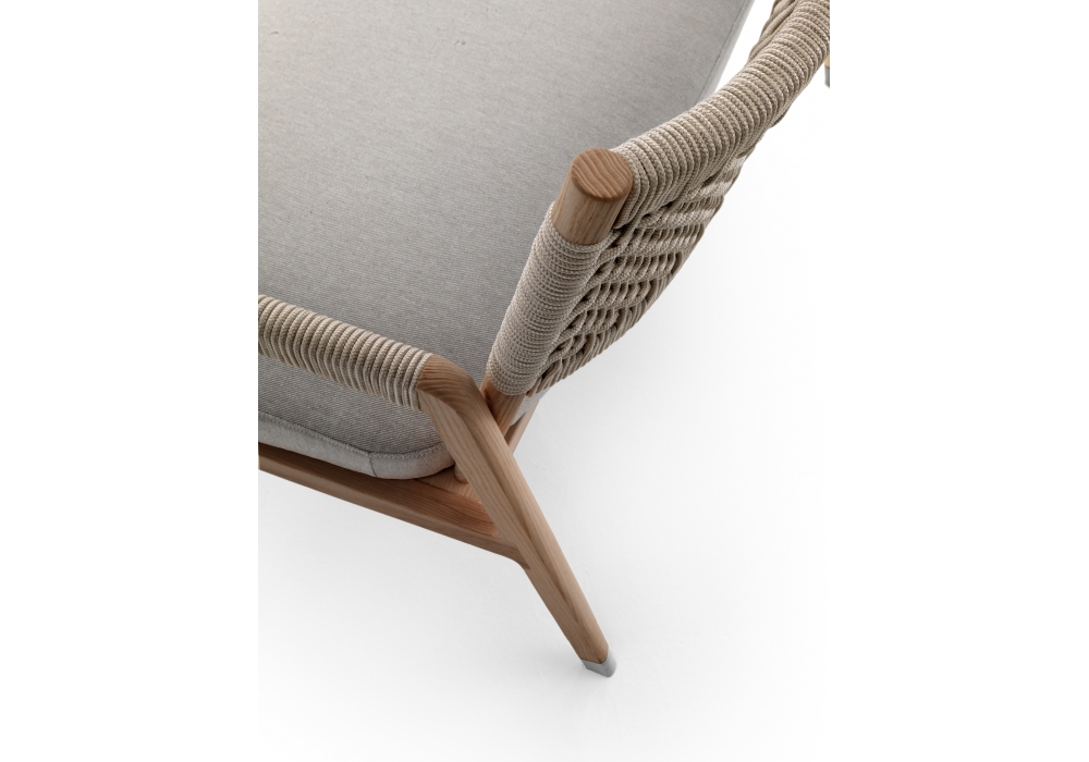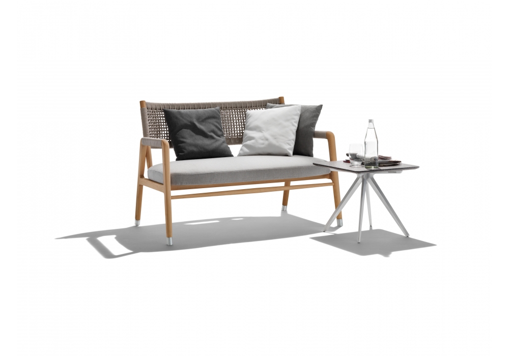 Ortigia Outdoor, von Antonio Citterio für Flexform entworfen, ist ein Sofa aus der Outdoor-Kollektion. Rückenlehne und Einsätze an den Armlehnen aus verflochtenen aus Polypropylen. Iroko Massivholzstruktur in natürlicher Ausführung, grau gebeizt und weiß lackiert. Sitzkissen mit Polyurethanschaum bezogen und wasserabweisendem Stoffbezug.
