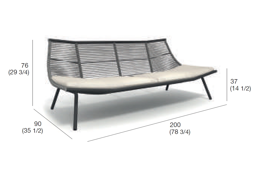Laze von Gordon Guillaumier für Roda entworfen, ist ein Outdoor-Sofa mit pulverbeschichteter Edelstahlstruktur und Korpus aus Polyester- oder Acrylschnüren.