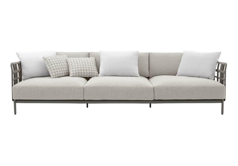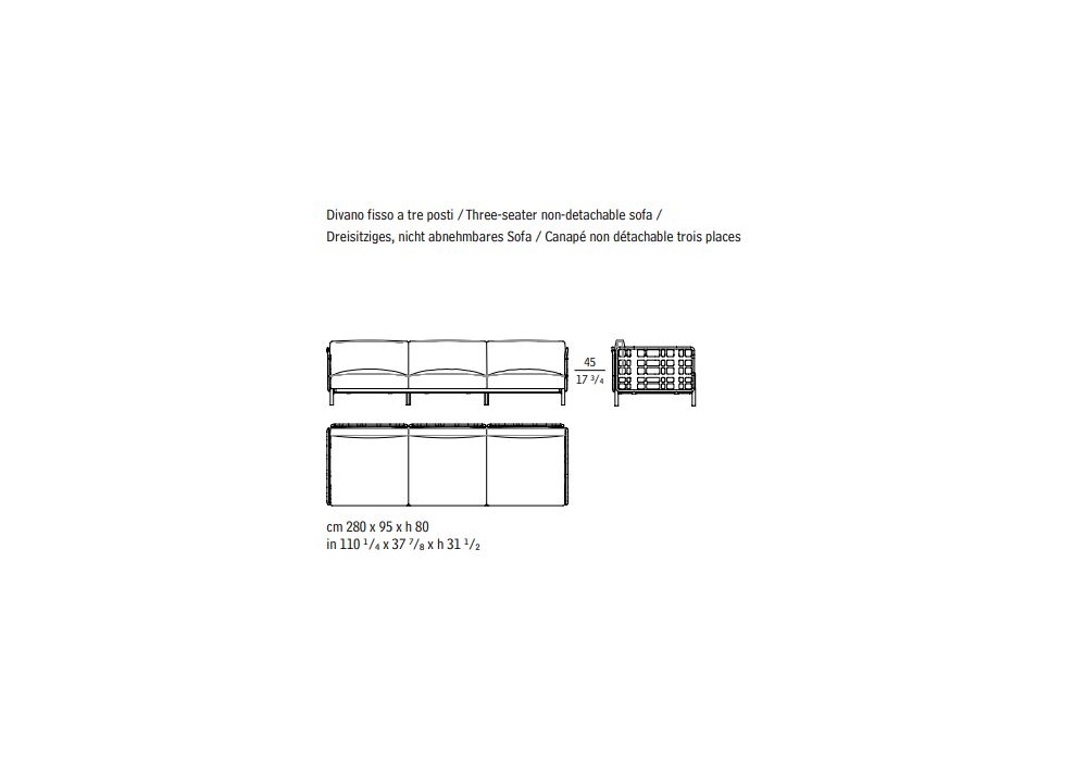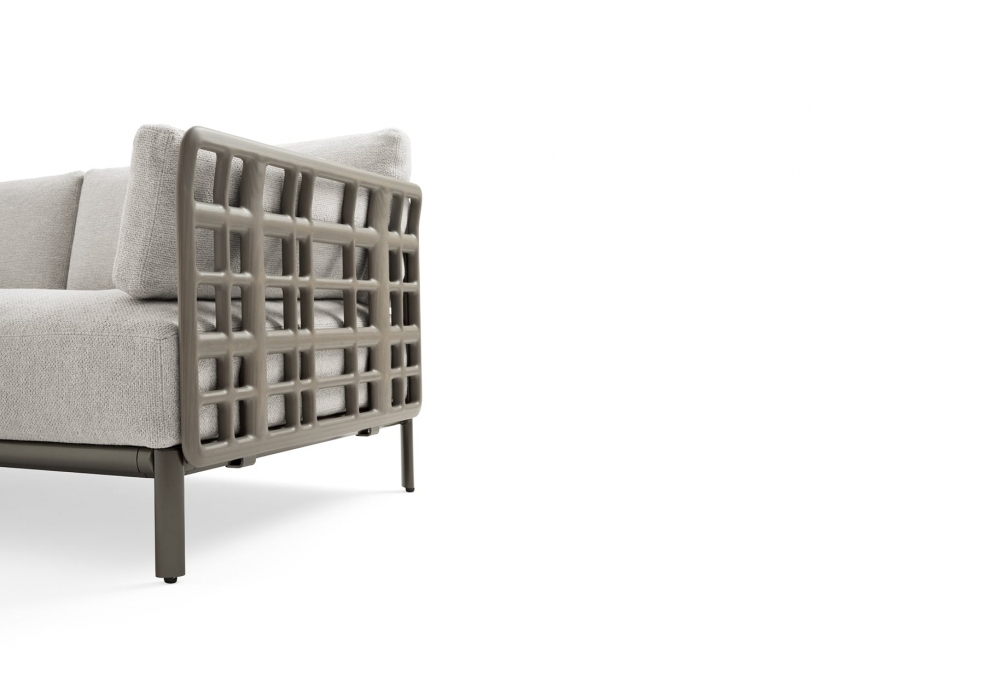 Aldìa von Carlo Colombo für Giorgetti entworfen, ist ein modulares Sofa mit Struktur aus lackiertem Metall mit Zinn-Finish. Die Rückenlehne und die Armlehnen sind aus neu zusammengesetztem Birkensperrholz, das in zwei Ausführungen erhältlich ist. Alle Kissen sind mit wasserdichtem Bezug und in verschiedenen Stoffen und Farben bezogen. Der Bezug ist abnehmbar. Aldìa ist in verschiedenen Modellen und Größen erhältlich; Einige Kompositionen werden unter Einbeziehung von Hockern und Couchtischen erstellt.