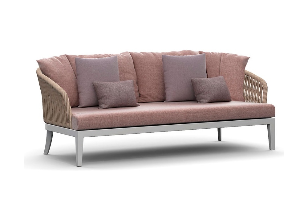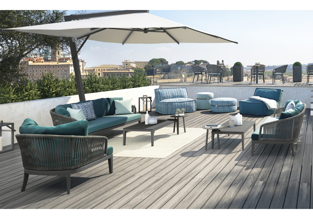Dream 2.0 von Atmosphera entworfen, ist ein Outdoor-Sofa mit Aluminium- und Seilstruktur. Rücken- und Sitzkissen Bezug in Stoff. Auf Anfrage ist es möglich, dekorative Kissen in mehreren Abmessungen hinzuzufügen.