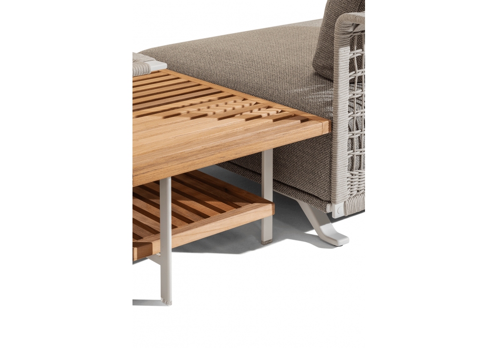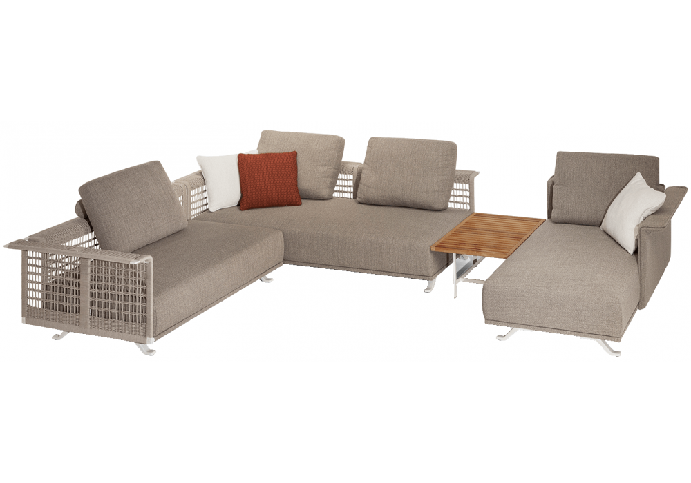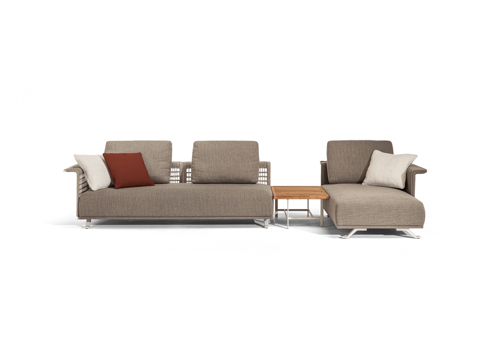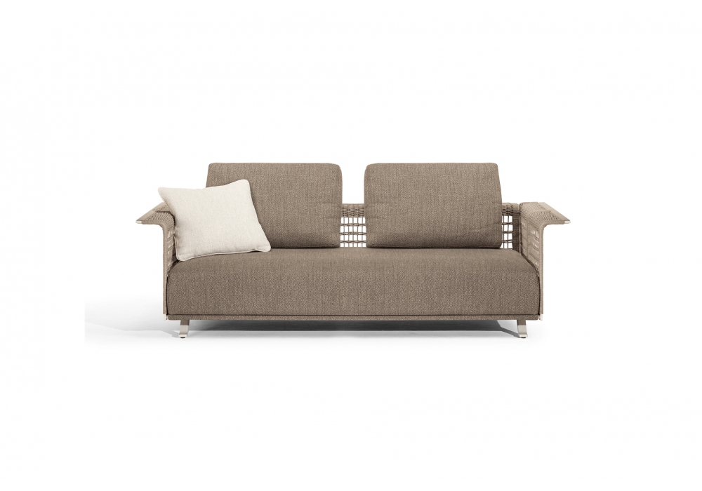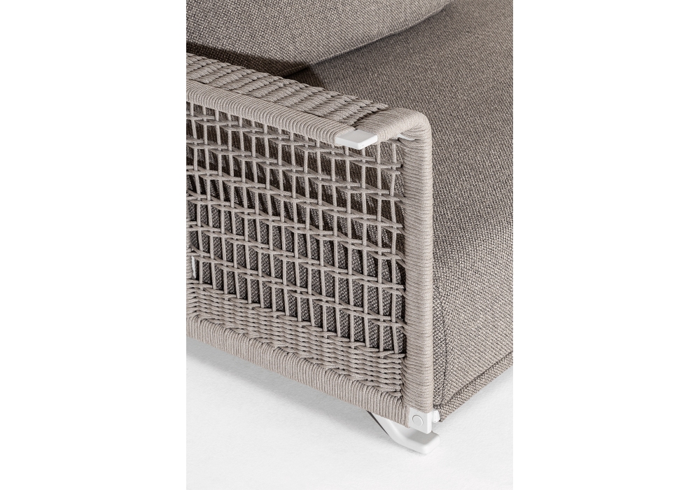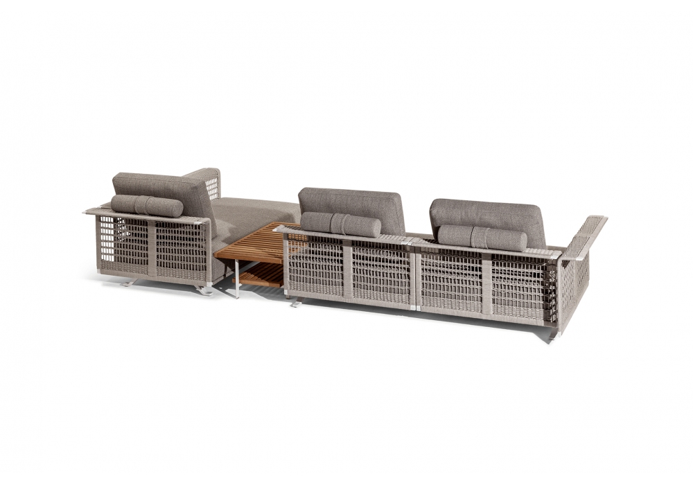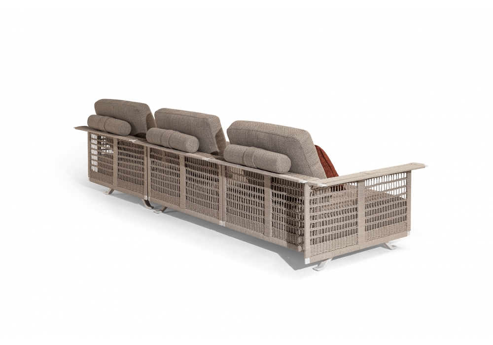 Solaria von Ludovica und Roberto Palombo für Poltrona Frau entworfen, ist ein modulares Outdoor-Sofa mit Struktur aus pulverbeschichtetem Edelstahl, die von dünnen Füßen getragen wird. Armlehnen und Rückenlehne, ebenfalls aus Edelstahl, sind mit einem handgewebten Seilgeflecht bezogen. Die gepolsterten Elemente sind abnehmbar und mit Soft-Touch-Outdoorstoff bezogen. Die Outdoor-Kissen sind so konzipiert, dass sie Wasser ableiten, sodass die Sofas schnell trocknen, und können mit anderen optionalen Kissen angereichert werden, um der Rückenlehne mehr Halt zu geben.