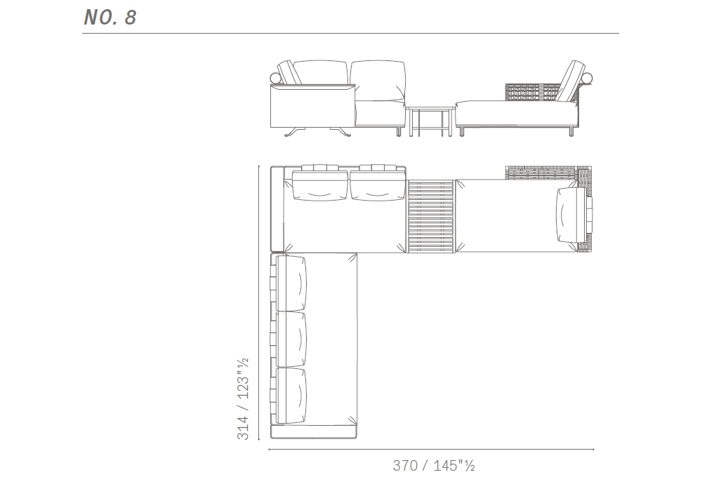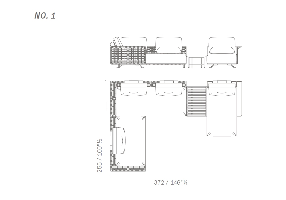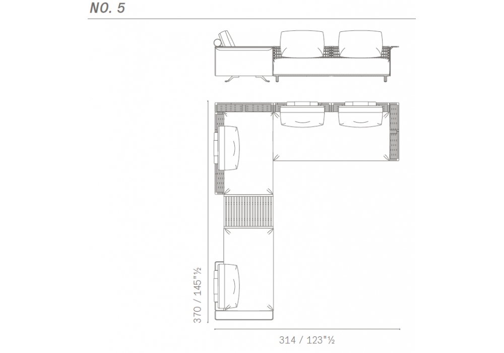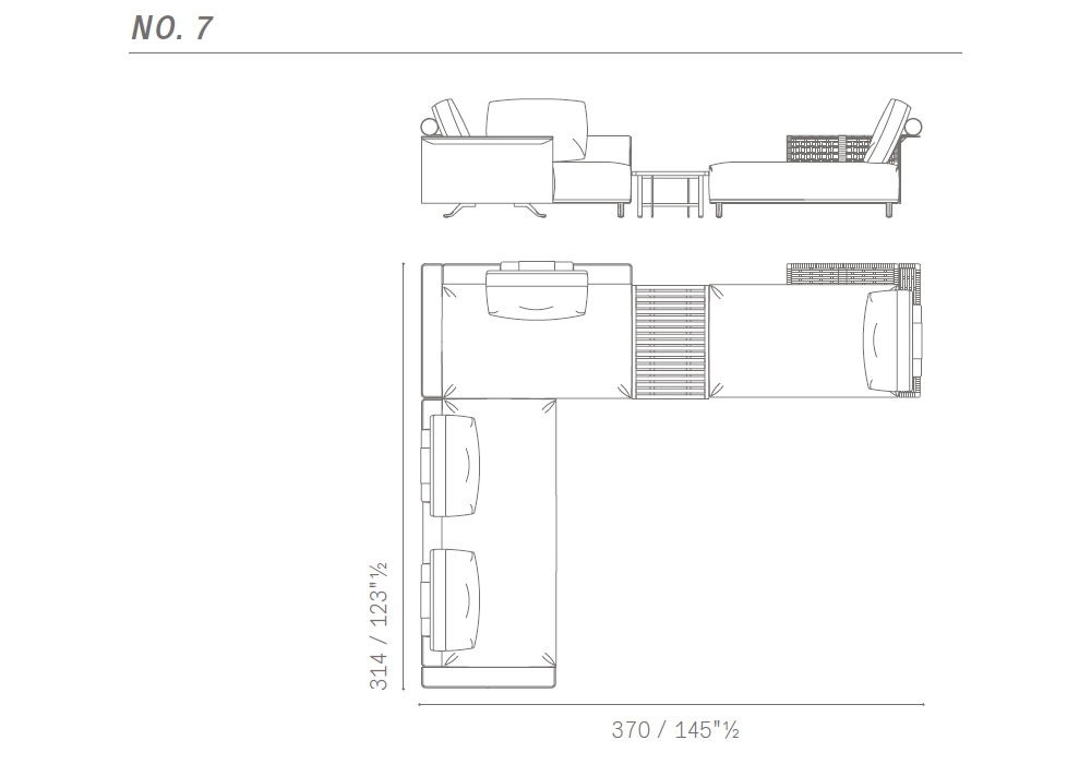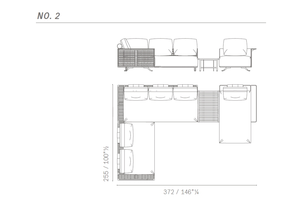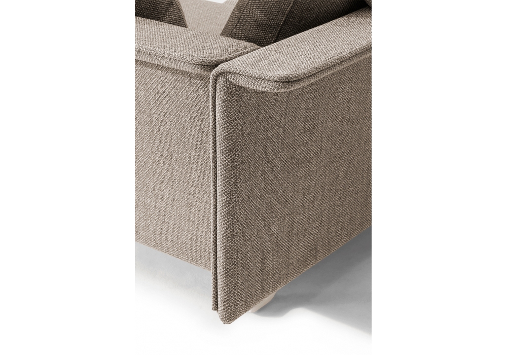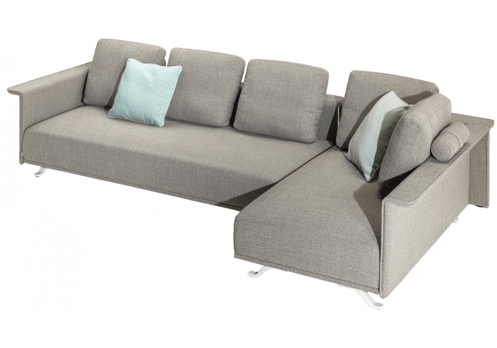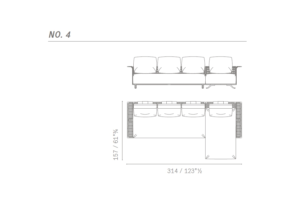 Solaria von Ludovica und Roberto Palombo für Poltrona Frau entworfen, ist ein modulares Outdoor-Sofa mit Struktur aus pulverbeschichtetem Edelstahl, die von dünnen Füßen getragen wird. Armlehnen und Rückenlehne, ebenfalls aus Edelstahl, sind mit einem handgewebten Seilgeflecht bezogen. Die gepolsterten Elemente sind abnehmbar und mit Soft-Touch-Outdoorstoff bezogen. Die Outdoor-Kissen sind so konzipiert, dass sie Wasser ableiten, sodass die Sofas schnell trocknen, und können mit anderen optionalen Kissen angereichert werden, um der Rückenlehne mehr Halt zu geben.