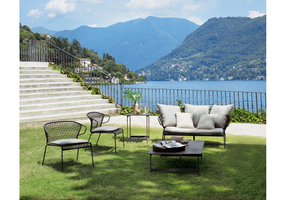 Vela von Hannes Wettstein für Potocco entworfen, ist ein strukturiertes Outdoor-Sofa komplett aus lackiertem Metall in verschiedenen Ausführungen. Sitz und Rücken sind mit einem Hanf- oder PVC-Seilgeflecht in verschiedenen Farben bezogen.