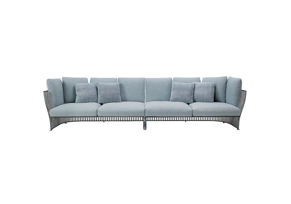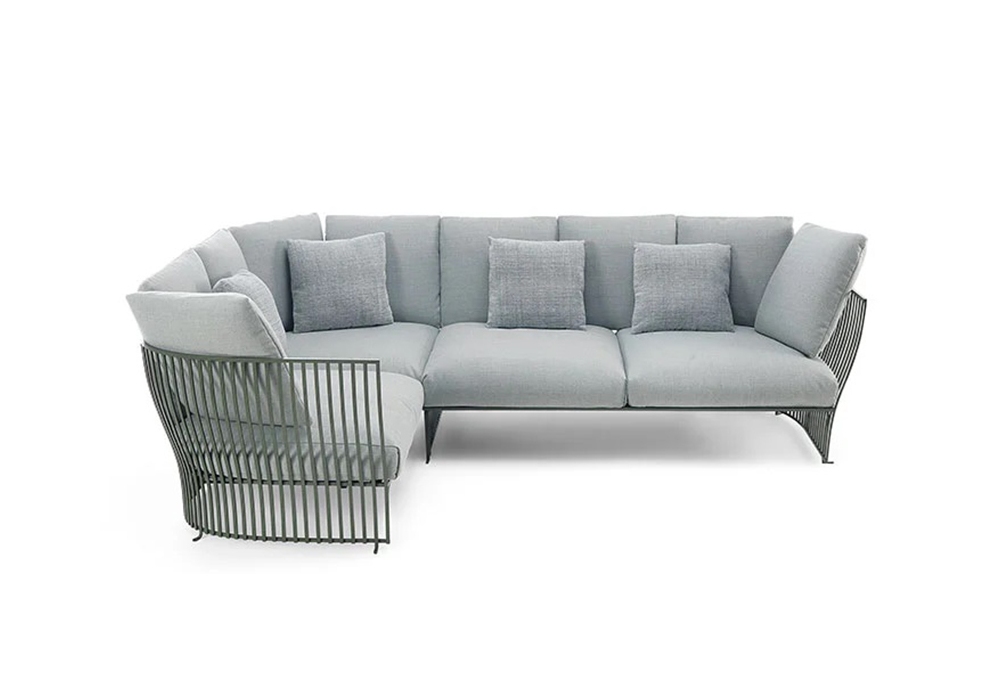 Venexia, von Luca Nichetto für Ethimo entworfen, ist ein modulares Sofa mit Struktur aus lackiertem Aluminium und Stoffbezug, verfügbar in verschiedenen Ausführungen.