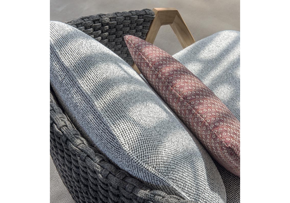 Knit von Patrick Norguet für Ethimo entworfen, ist ein Dreisitzer-Sofa mit Struktur aus Teakholz in natürlicher oder gebeizter Ausführung, das mit einem Seilgeflecht bedeckt ist. Die Sitz- und Rückenkissen sind aus Polypropylengewebe. Strick ist in verschiedenen Ausführungen und Beschichtungen erhältlich.