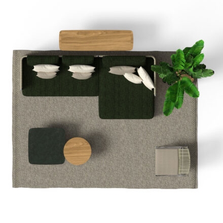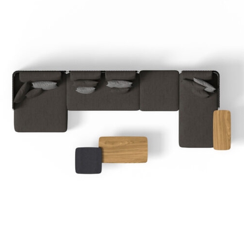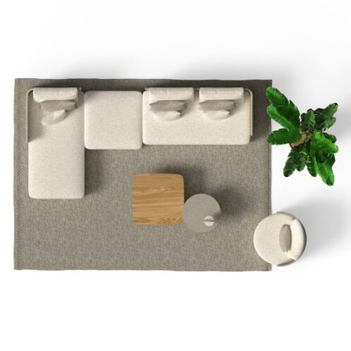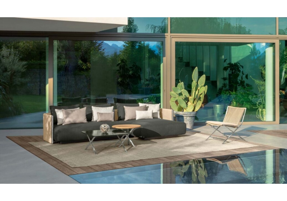 George von Ludovica und Roberto Palomba für Talenti entworfen, ist ein Outdoor-Sofa mit gewebten gepolsterten Riemen auf einer Stahlstruktur und mit Stoff gepolsterten Kissen.