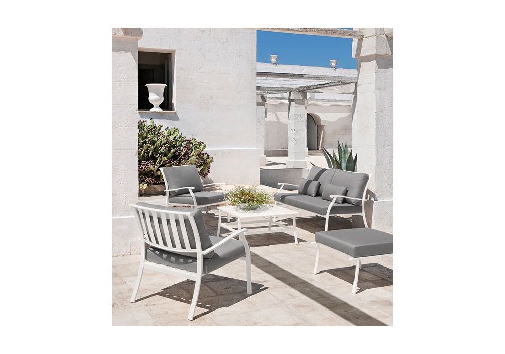 Elisir, hergestellt und signiert von Ethimo, ist ein 2-Sitzer-Sofa mit tragender Struktur aus lackiertem Metall. Die Kissen sind mit wasserabweisendem Acrylstoff bezogen. Elisir ist in verschiedenen Ausführungen erhältlich.